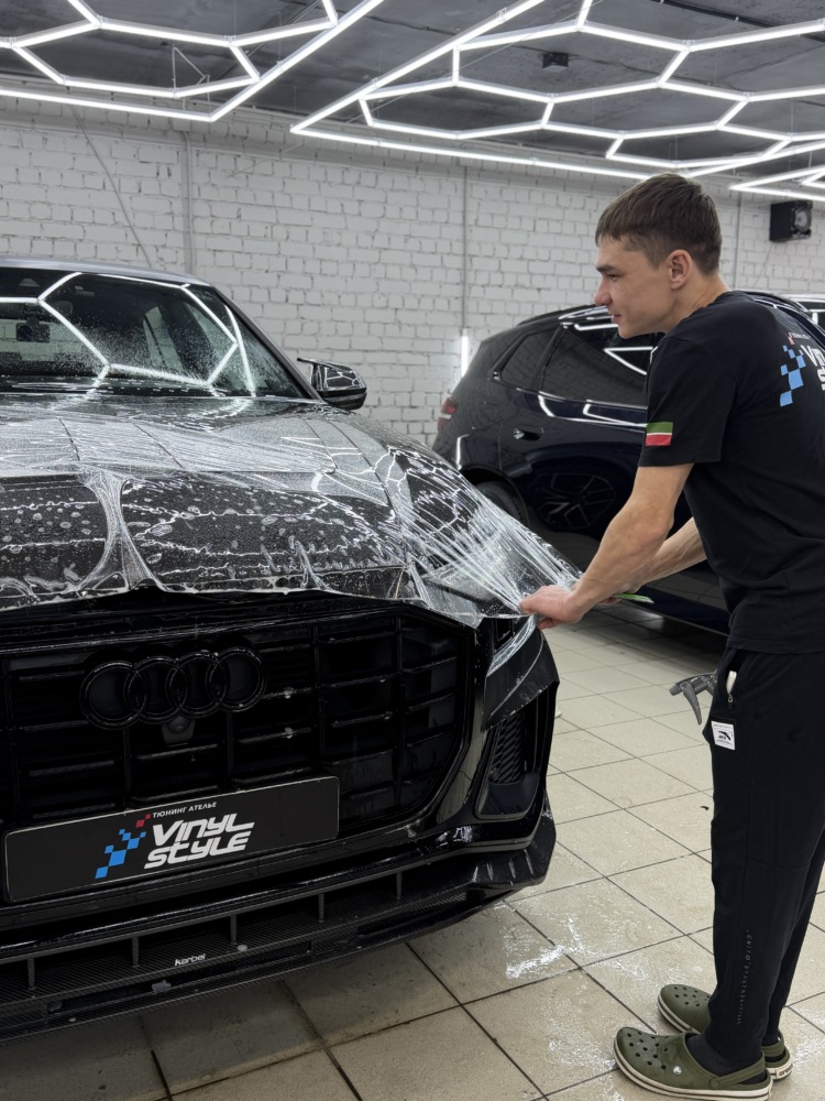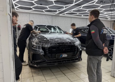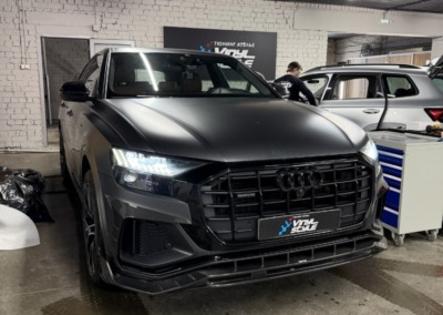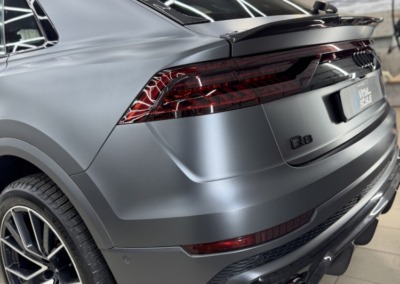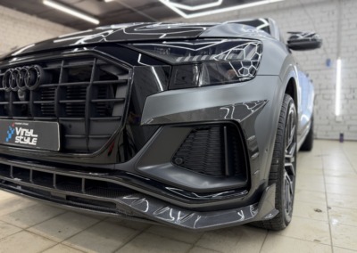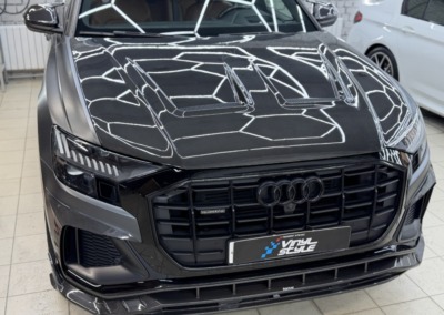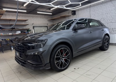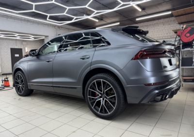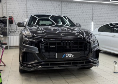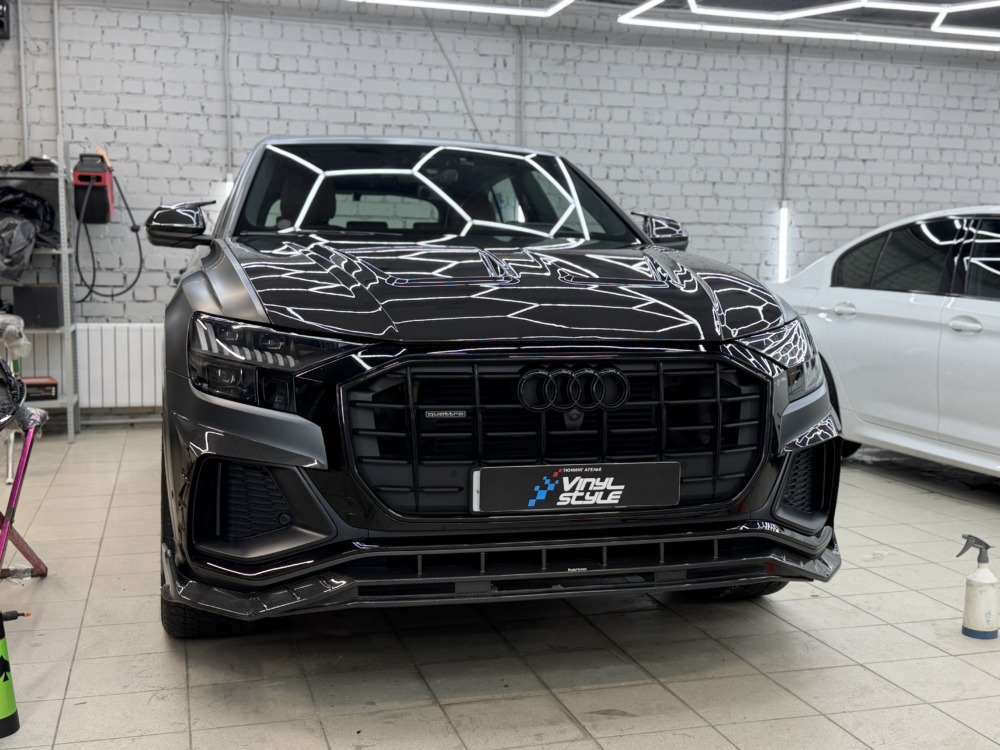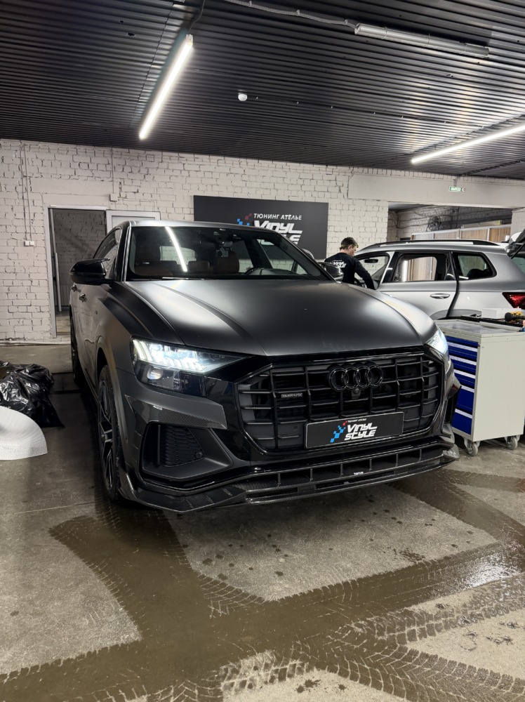 Эксперименты с Audi Q8 продолжаются. Ранее автомобиль был покрыт матовой плёнкой, заменён диффузор с насадками, отшиты ковры в салон, установлены выдвижные пороги, а также сделаны карбоновые вставки.