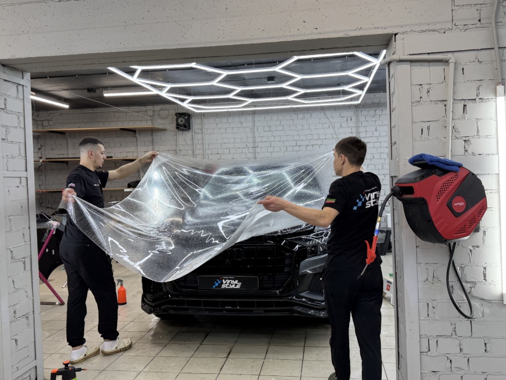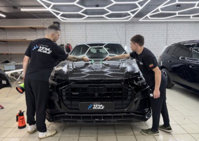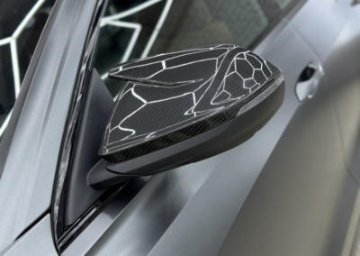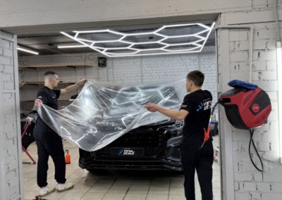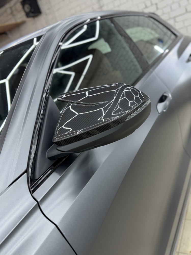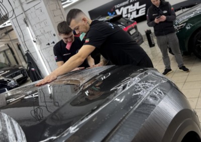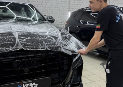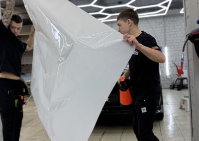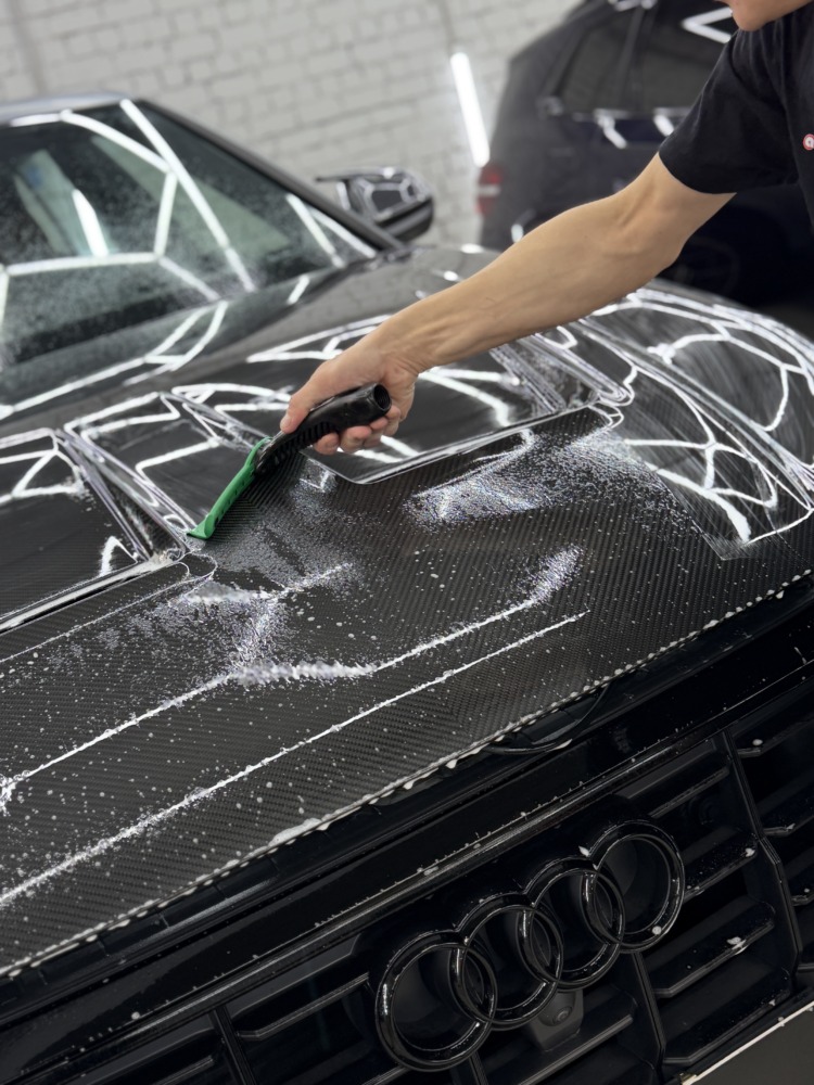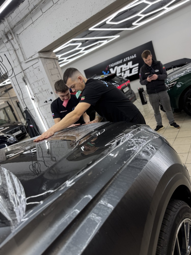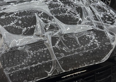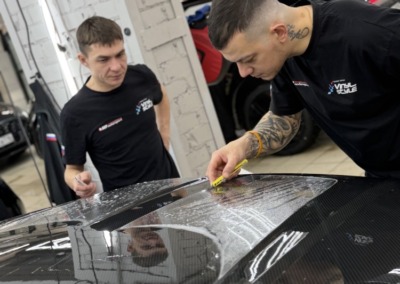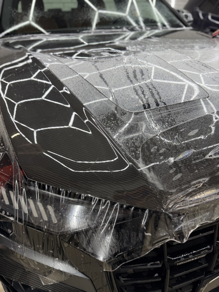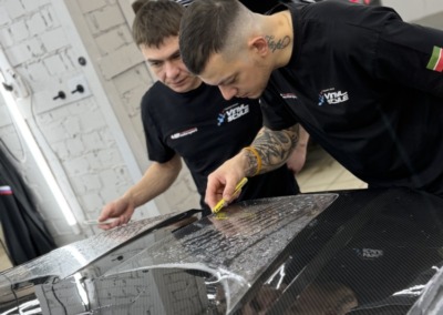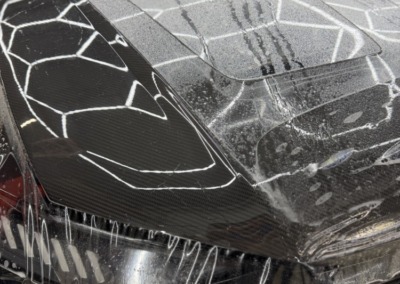 Но на этом владелец не остановился. Теперь мы установили карбоновый капот, и чтобы эта дорогая деталь не потеряла свой вид, забронировали её полиуретановой плёнкой.