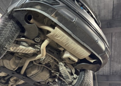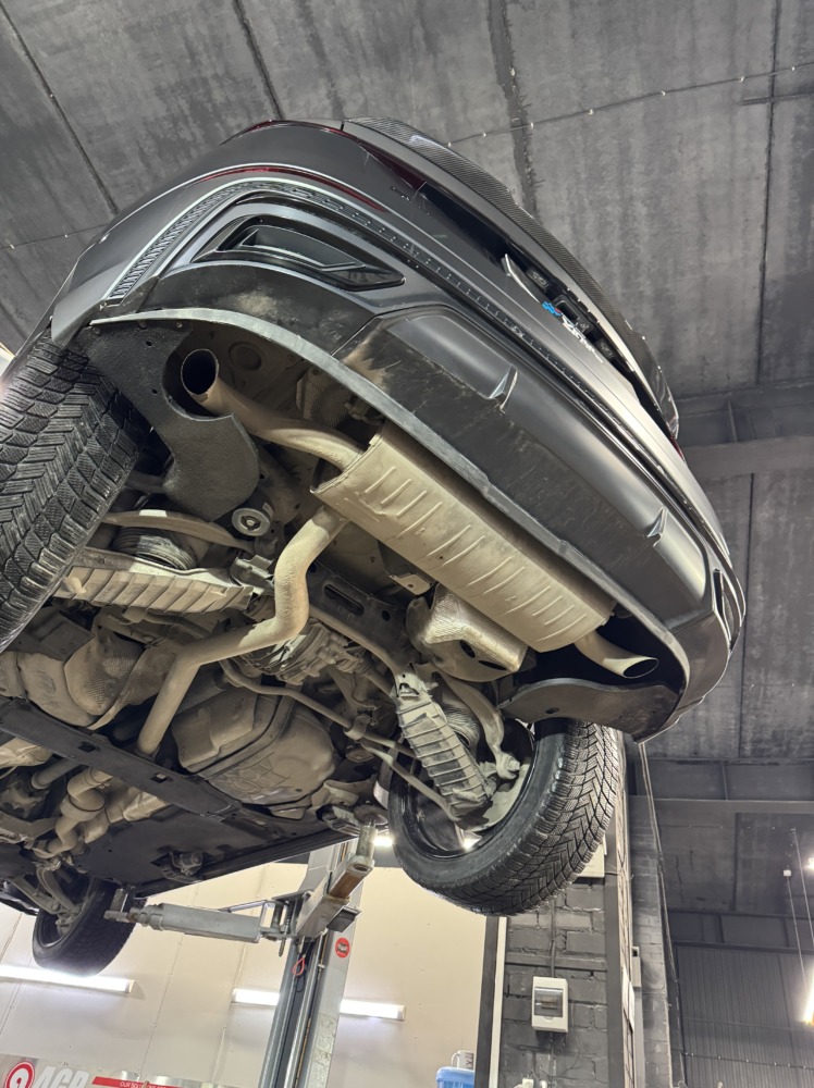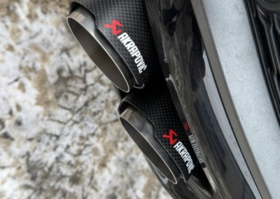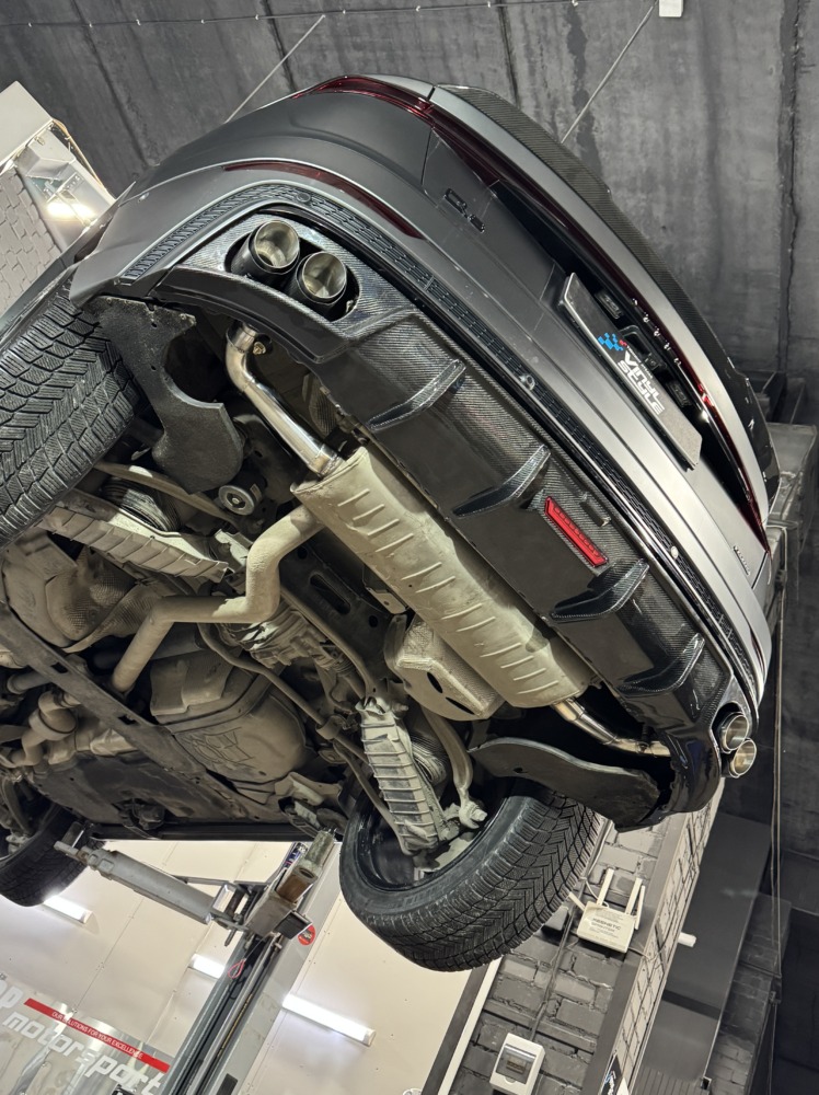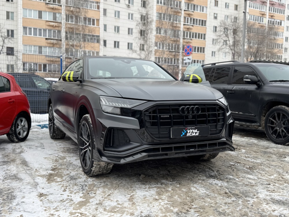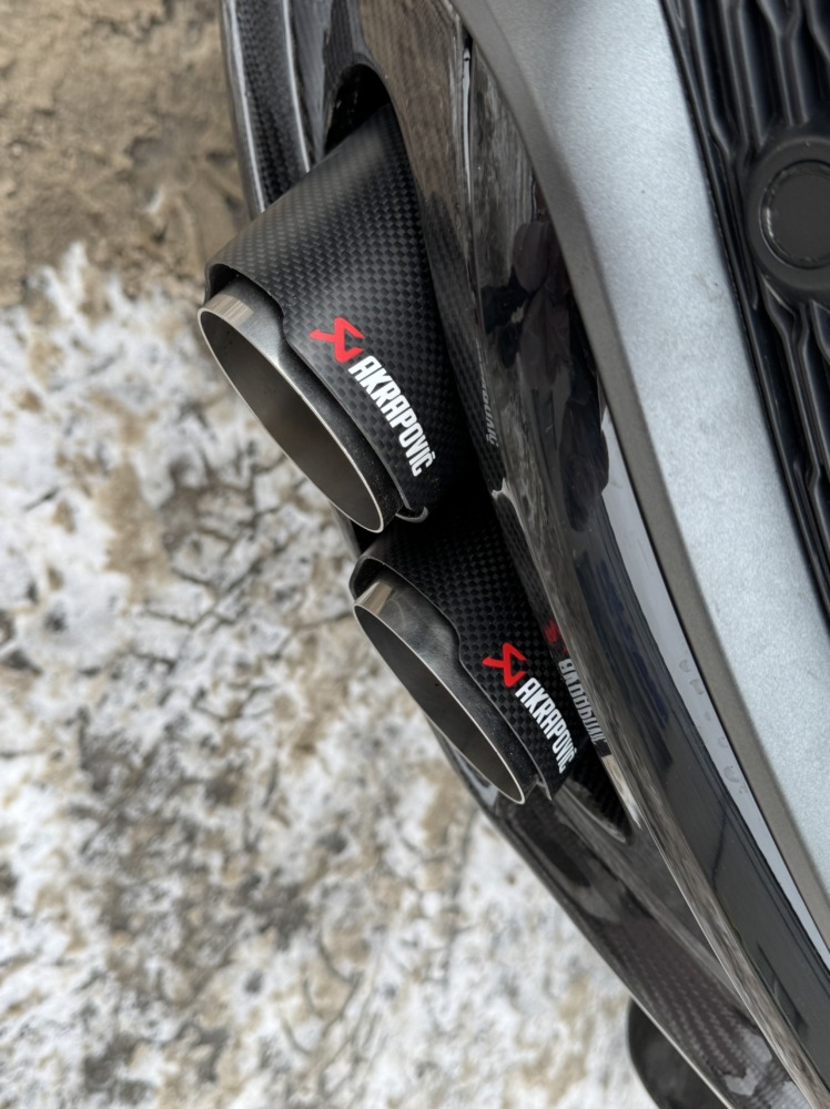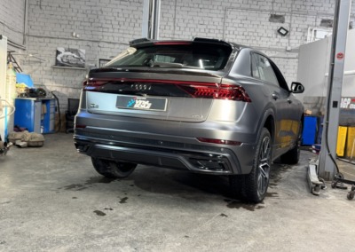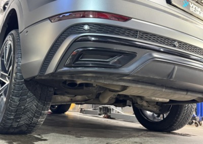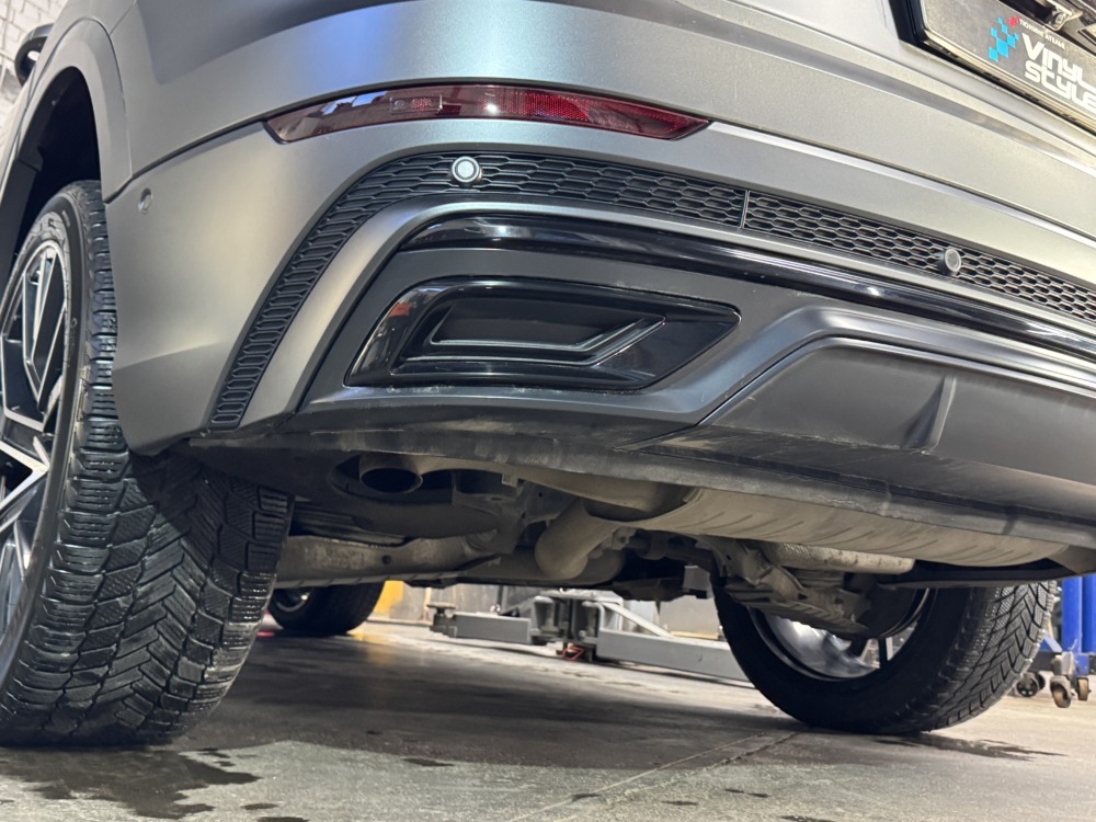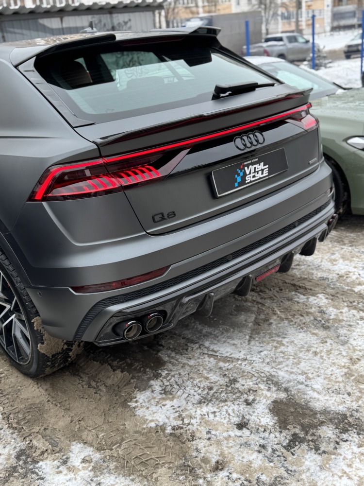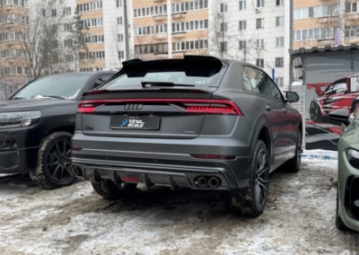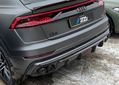 Audi Q8 — замена заднего диффузора и насадок выхлопной системы С завода на Audi Q8 выхлопные трубы направлены вниз. После замены заднего диффузора трубы вывели к насадкам и установили двойные декоративные насадки Akrapovič.