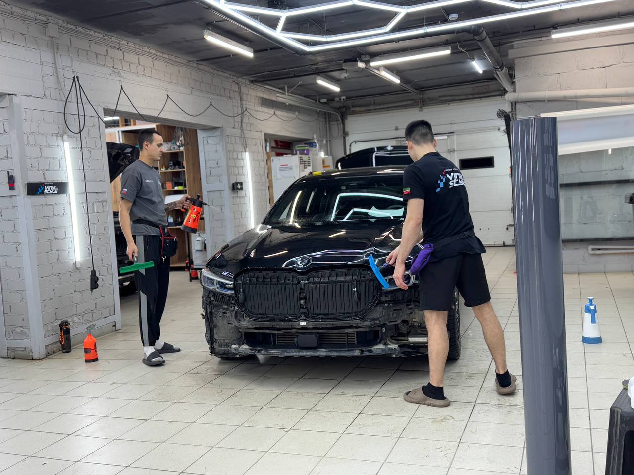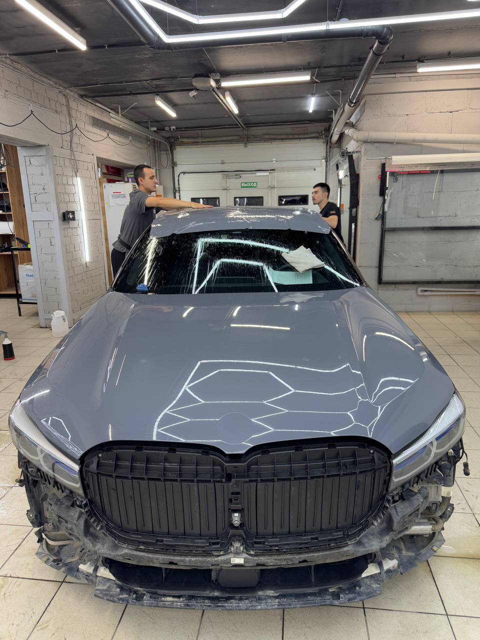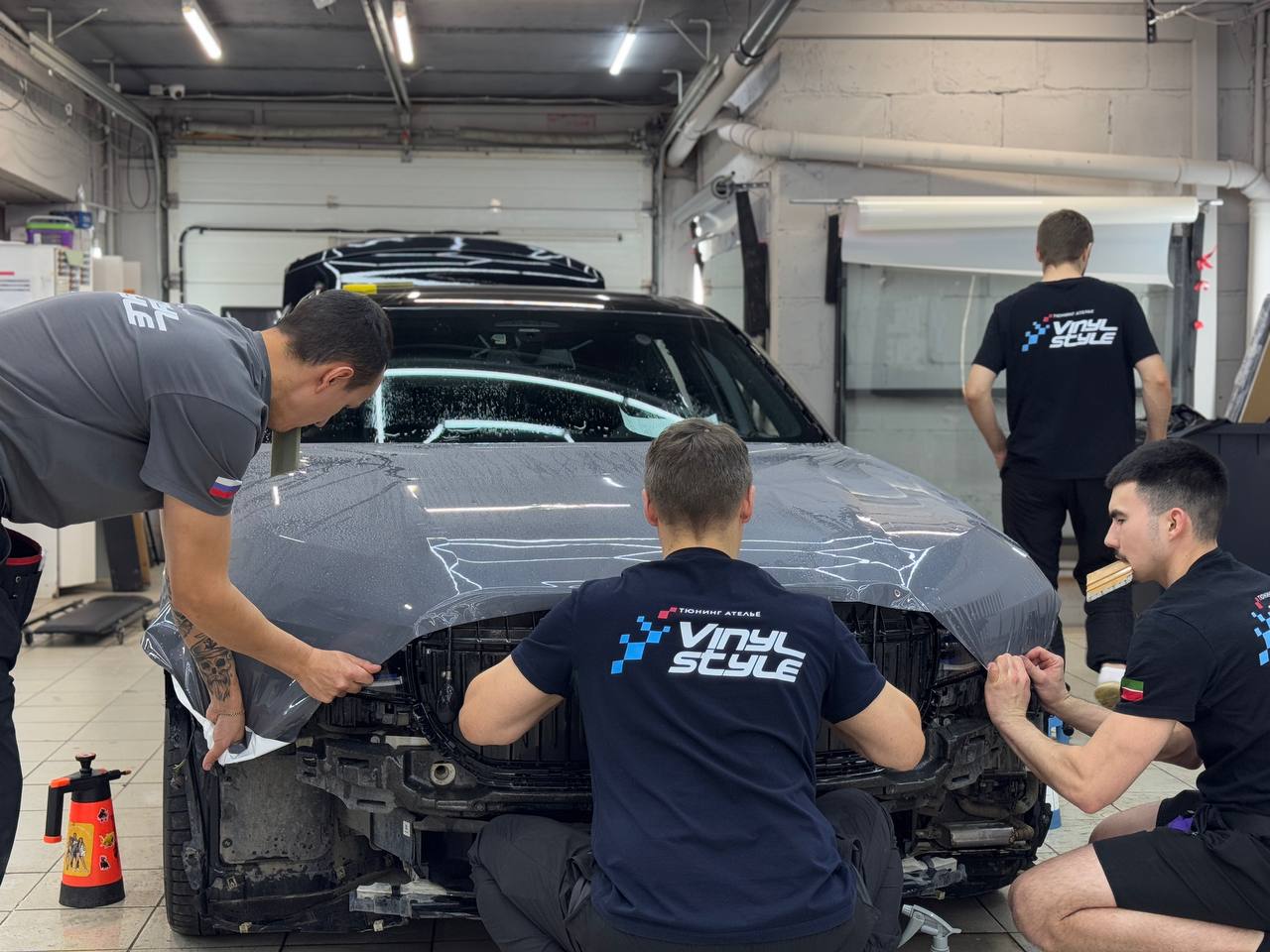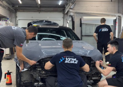 Задача стояла простая: оклеить автомобиль в тот же Nardo Grey. Оттенок плёнки подбирали прямо на машине, чтобы добиться идеального совпадения.