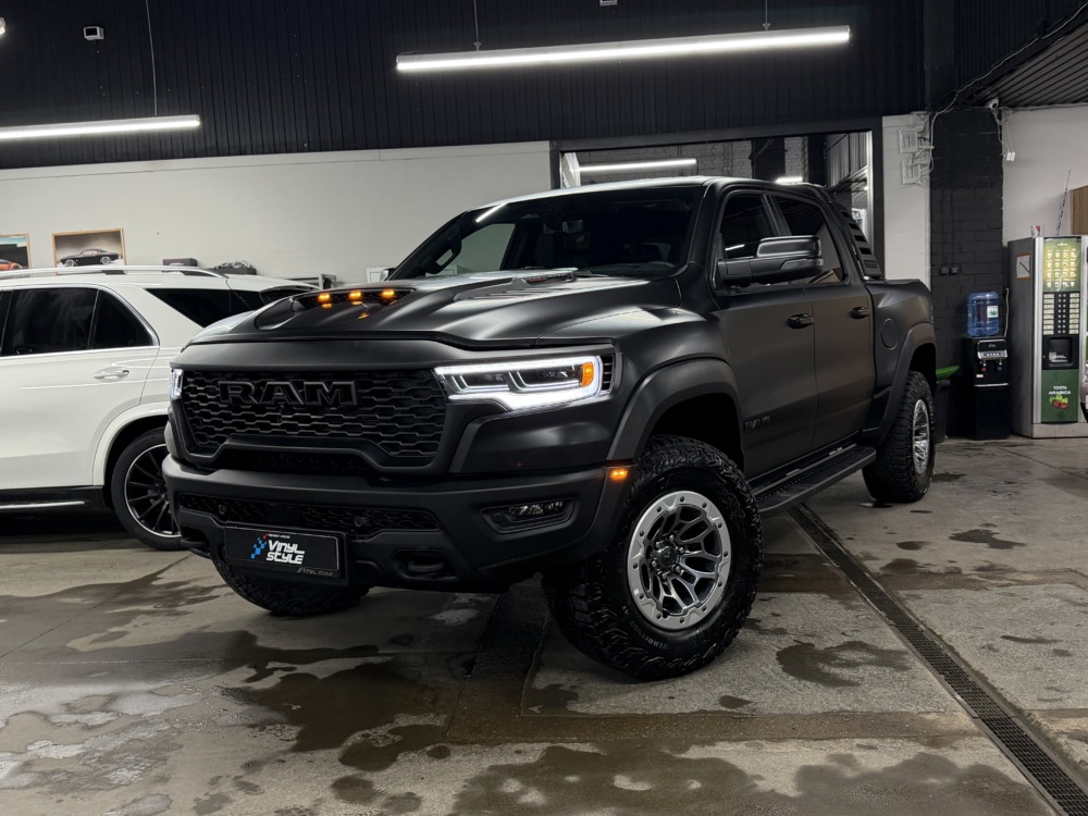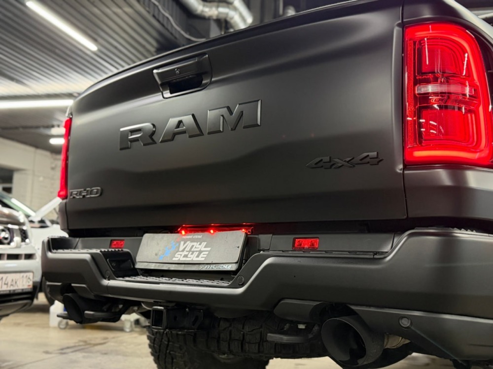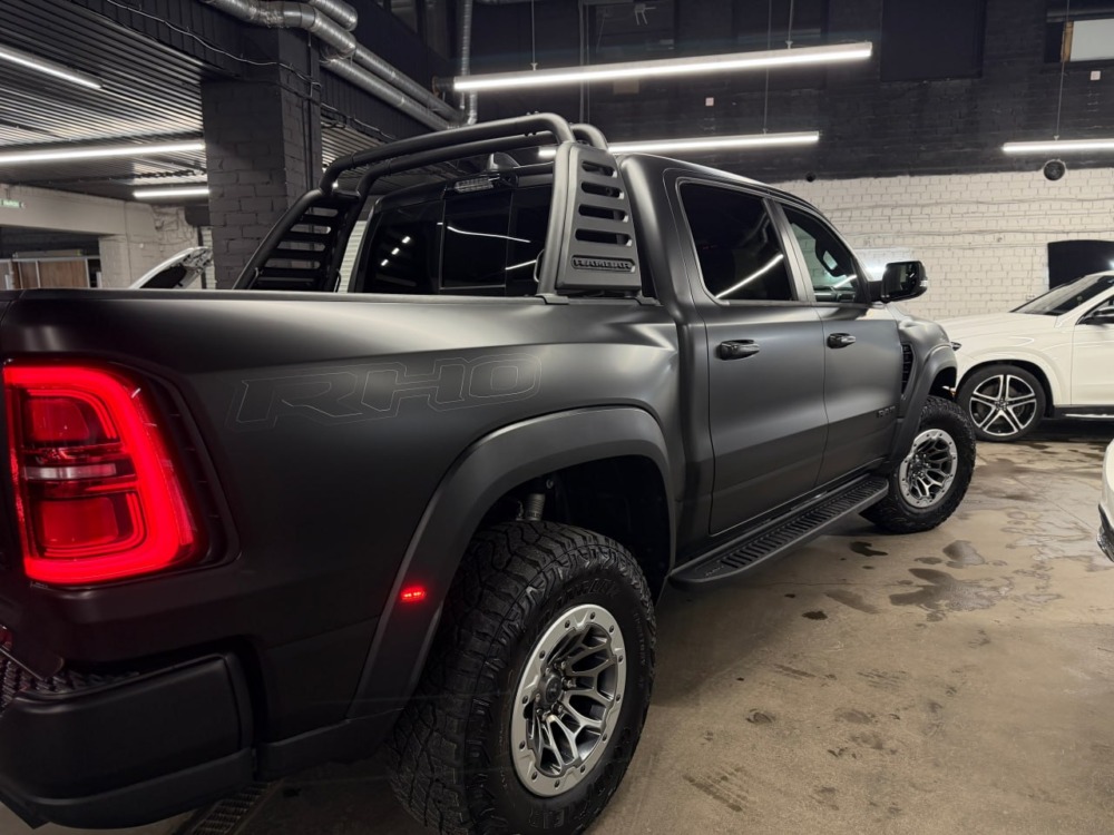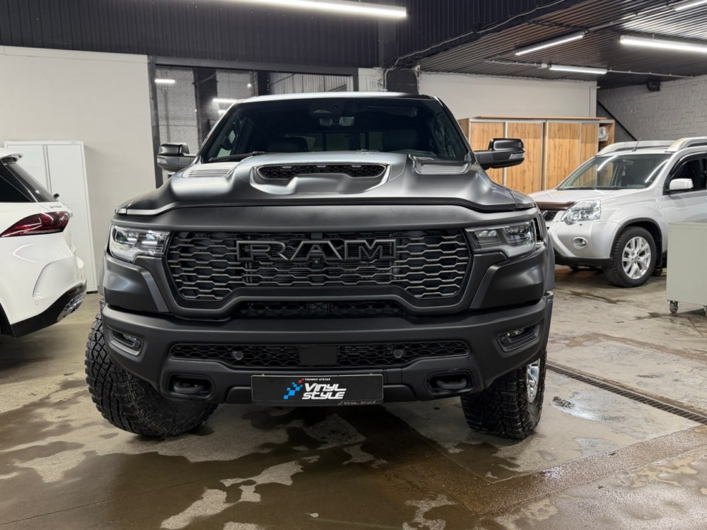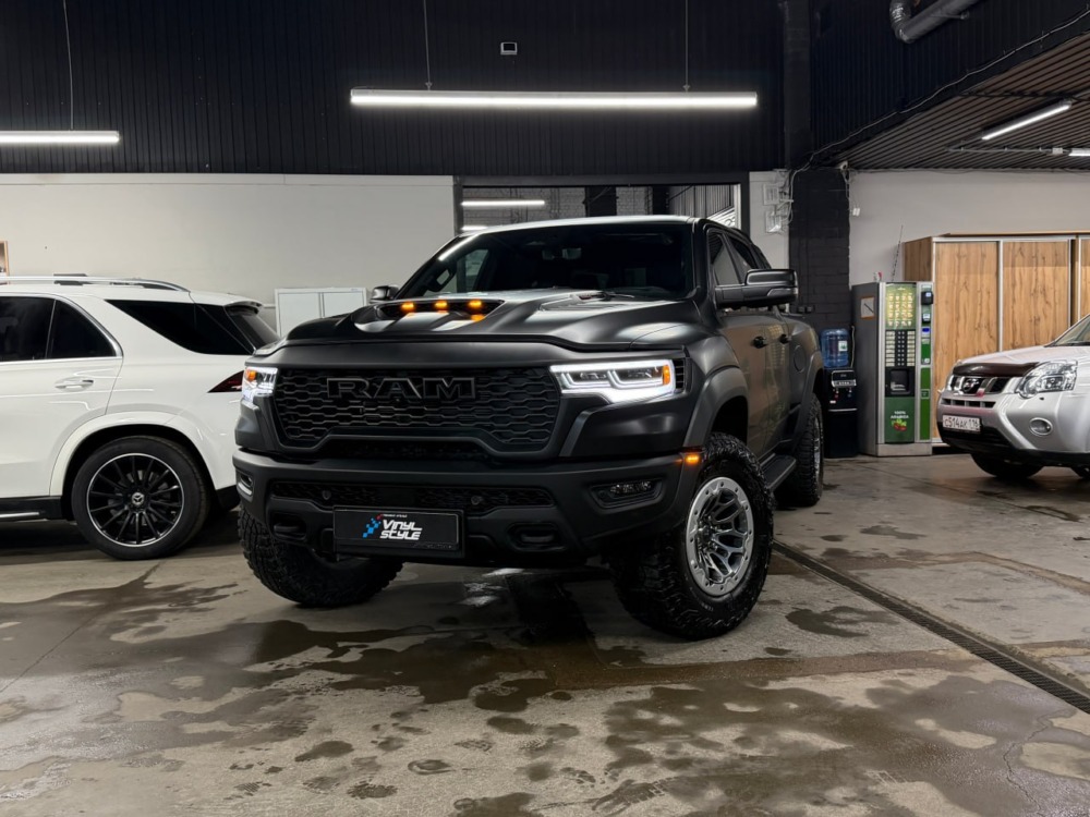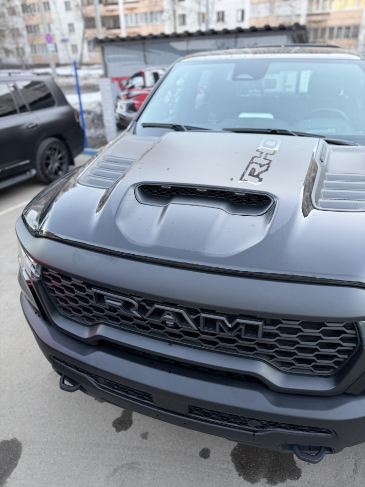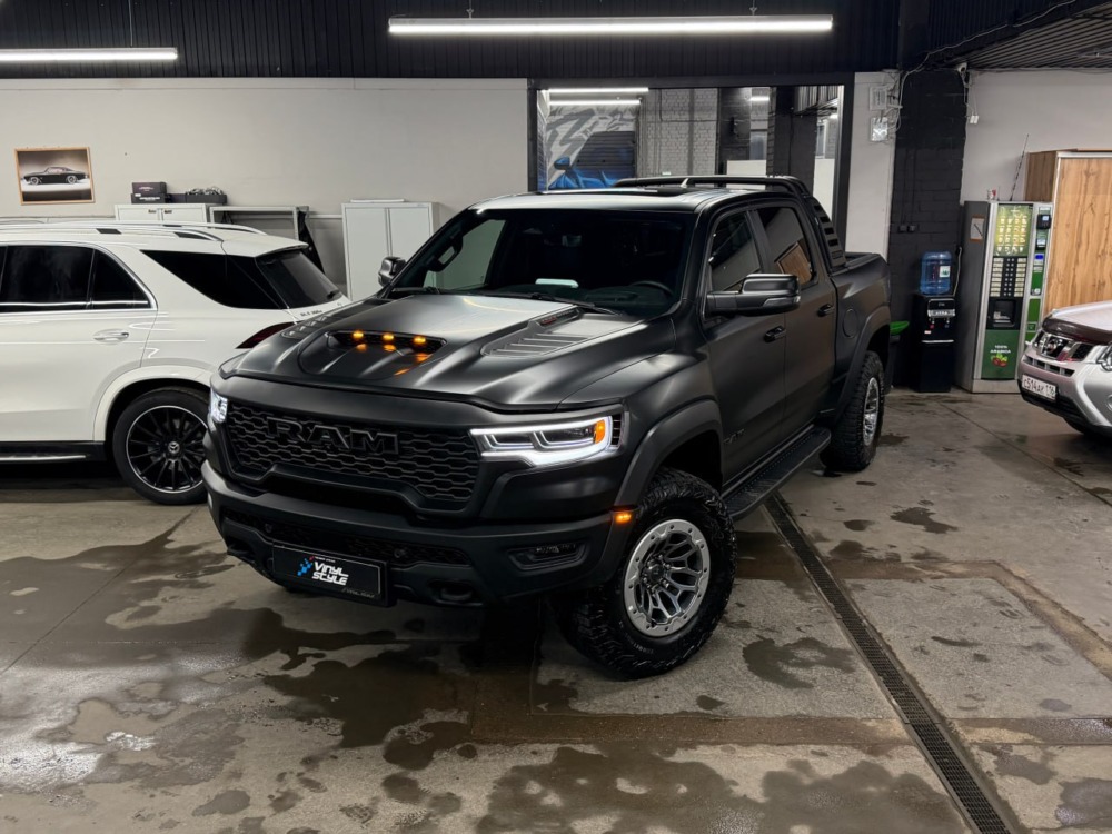 Страшный сон легковушек! Dodge Ram RHO, чёрный, оклеенный в мат, с забронированным в мат салоном, лобовое стекло тоже в защитной плёнке.