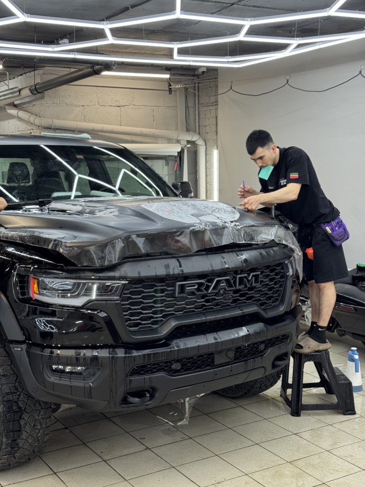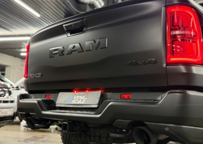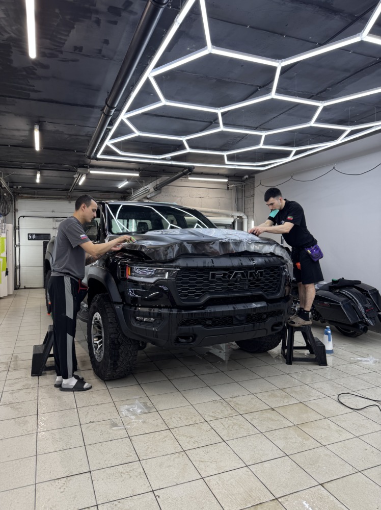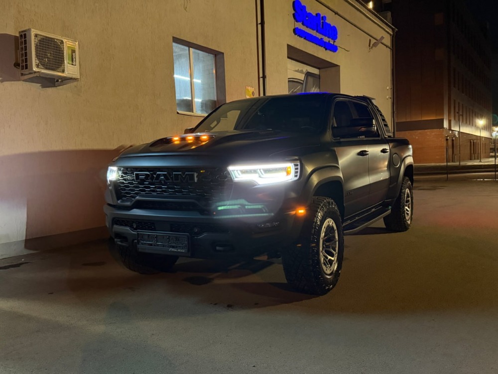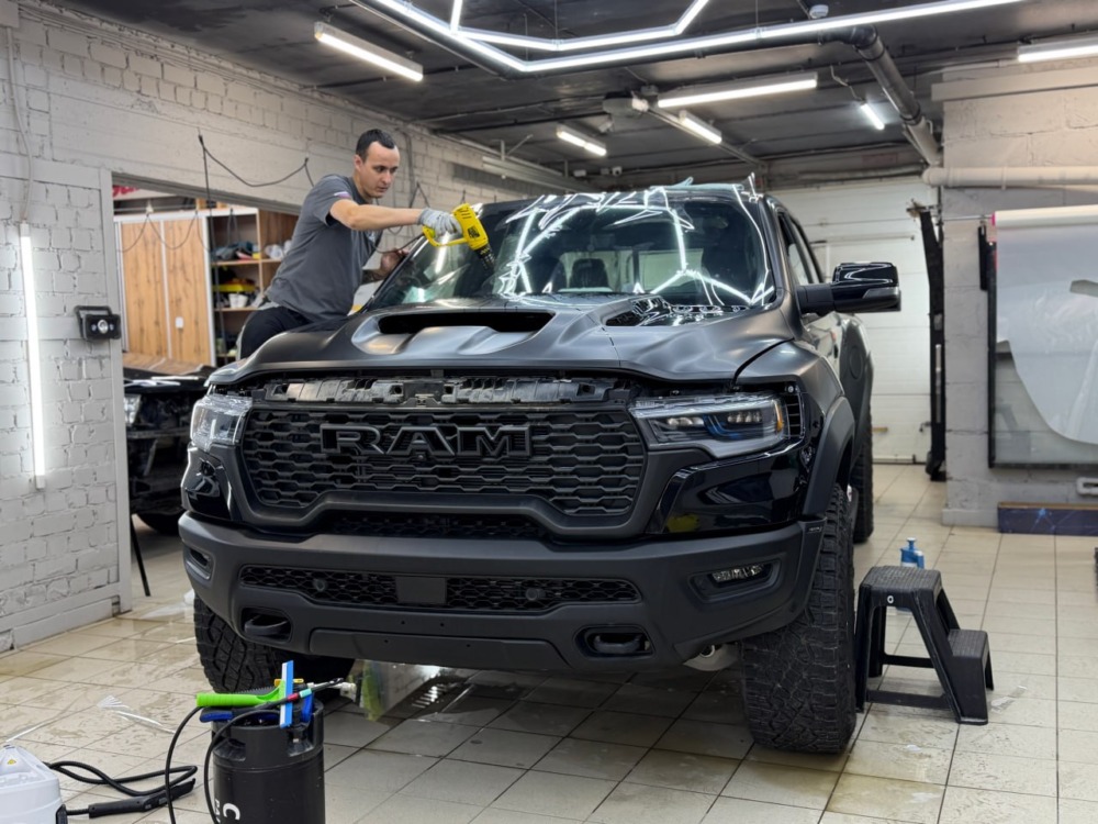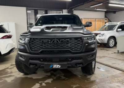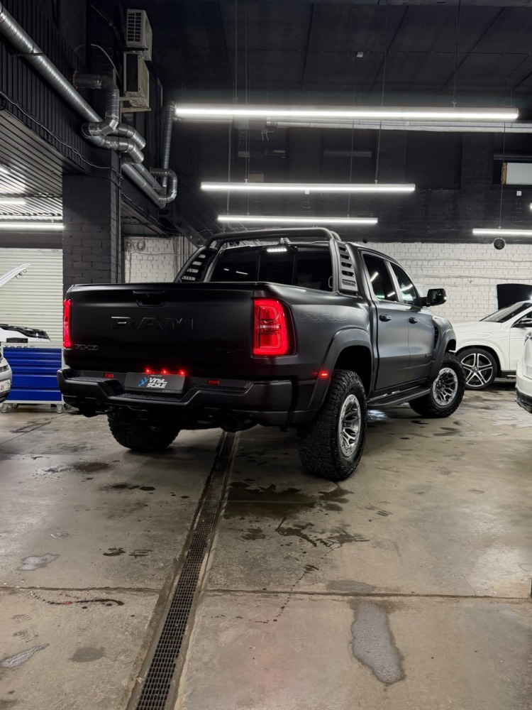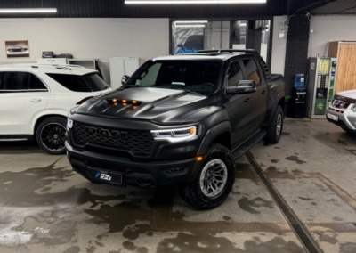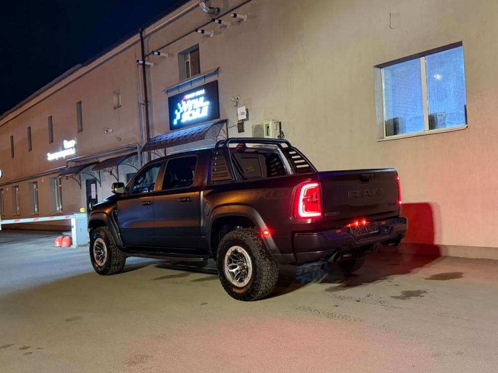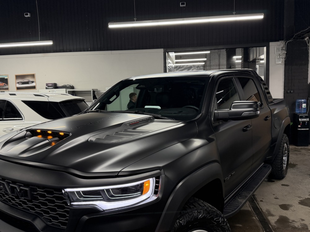 Страшный сон легковушек! Dodge Ram RHO, чёрный, оклеенный в мат, с забронированным в мат салоном, лобовое стекло тоже в защитной плёнке.