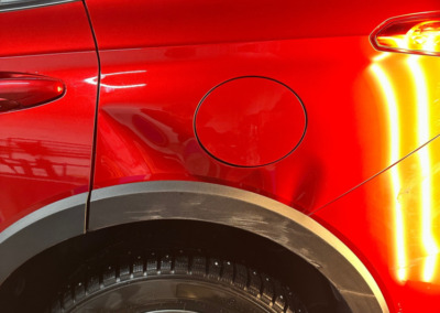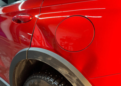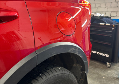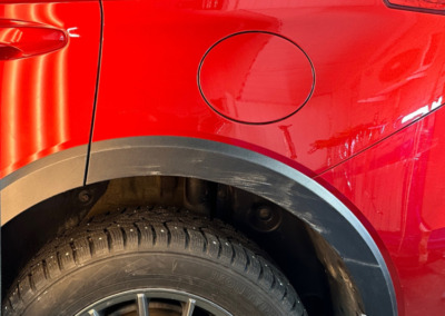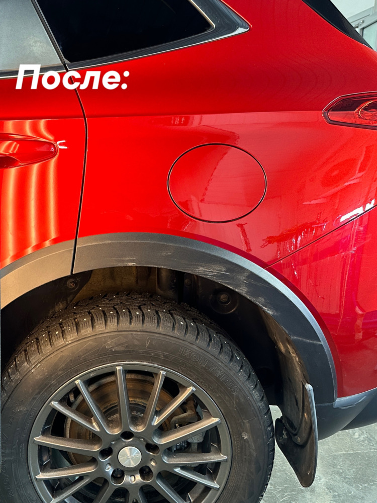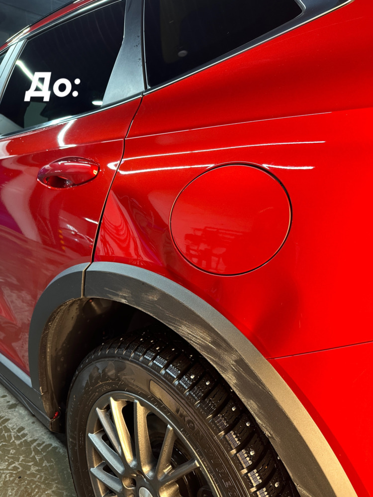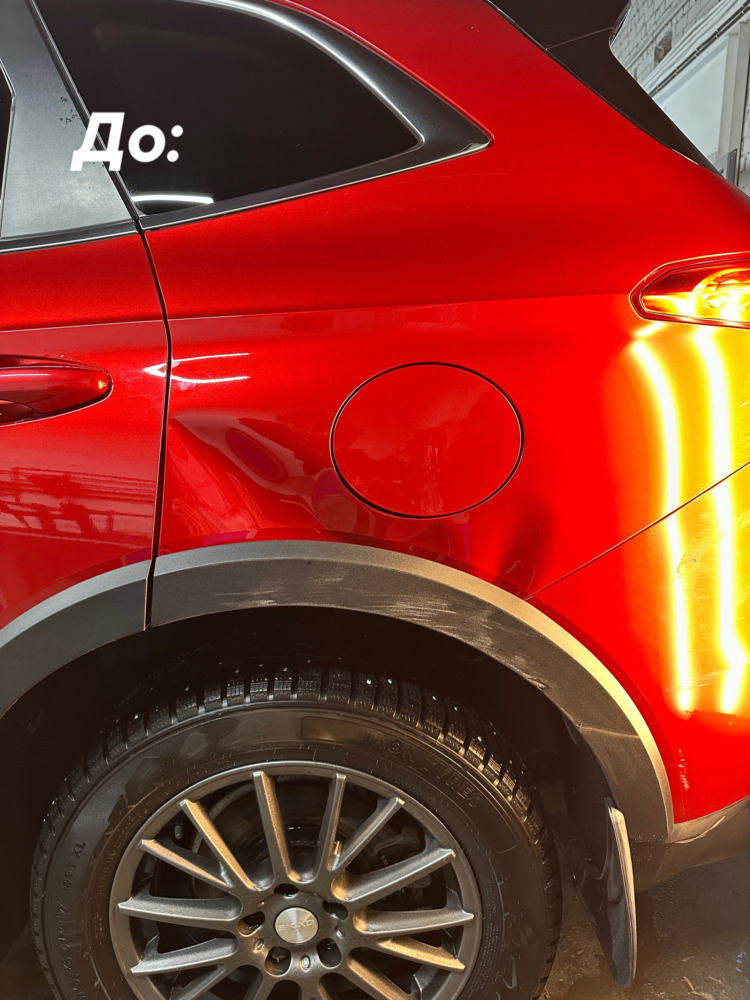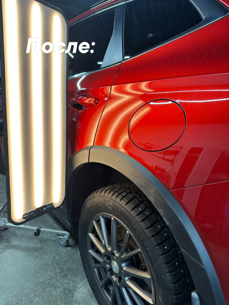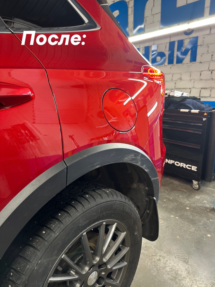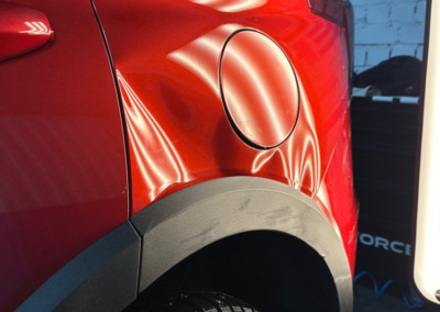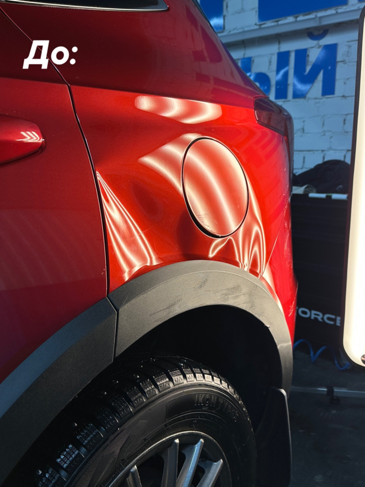 Вмятина на этом Haval Jolion была достаточно сложной, так как в данном месте расположена горловина бензобака. Геометрия крыла была полностью нарушена: от удара сместился внутренний металл, находящийся над подкрылком.