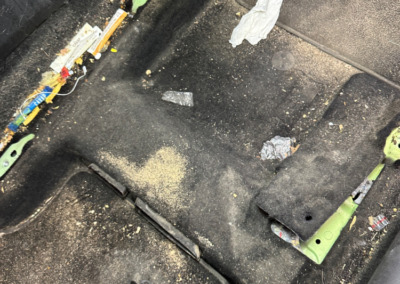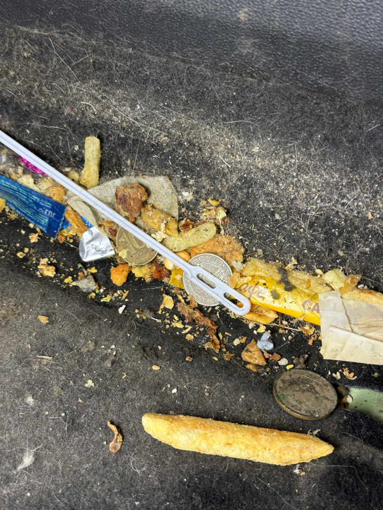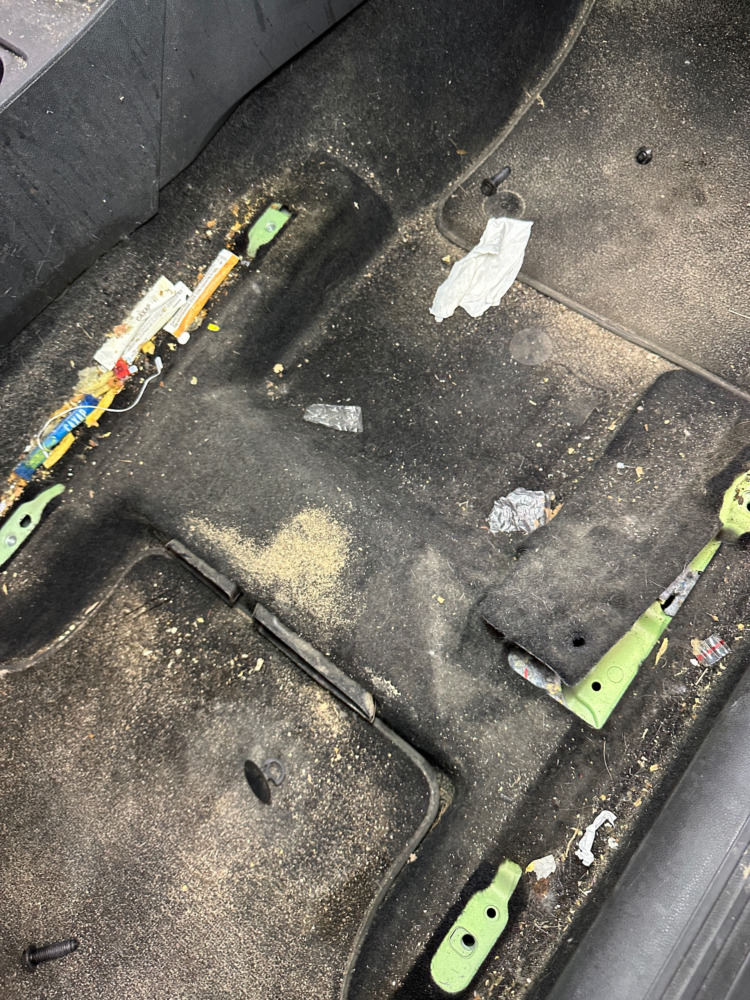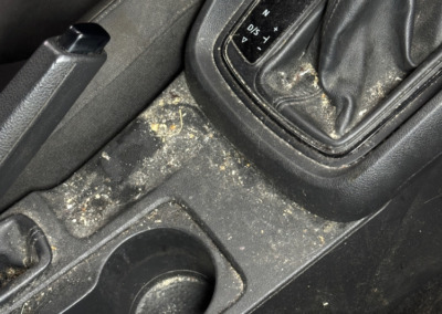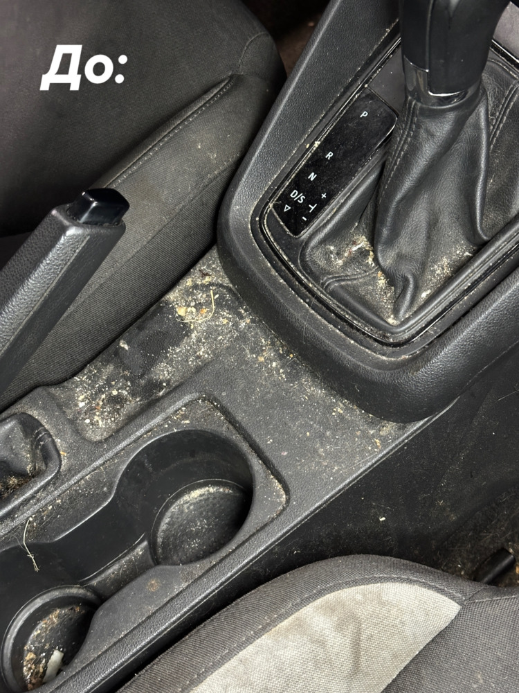 Так он выглядел до начала работ — пыль, грязь, крошки, пятна и мусор в труднодоступных местах. В подлокотниках, возле рычага КПП и под сиденьями накопилось всё: от монет и обёрток до остатков еды.