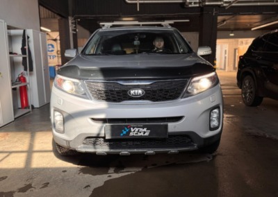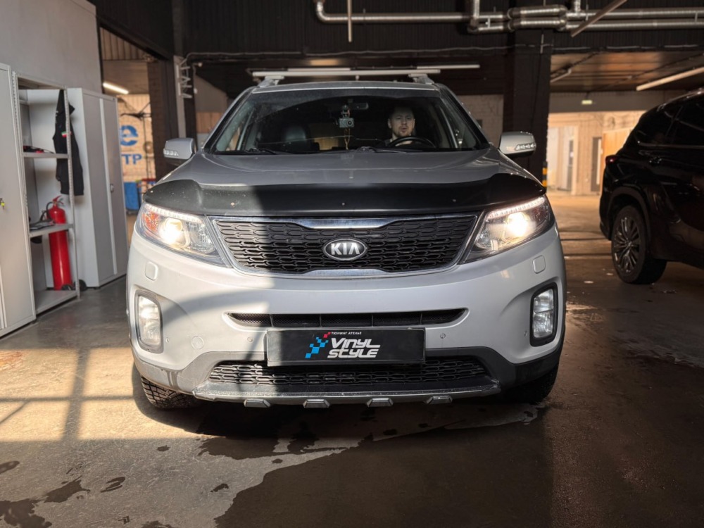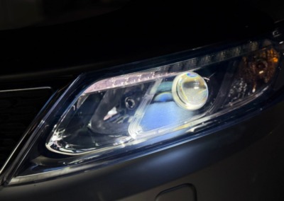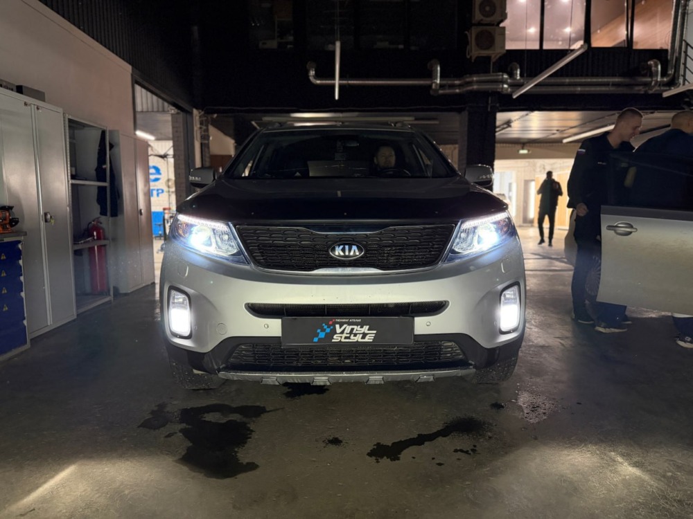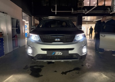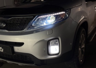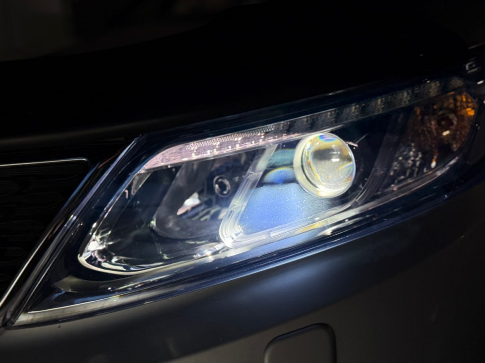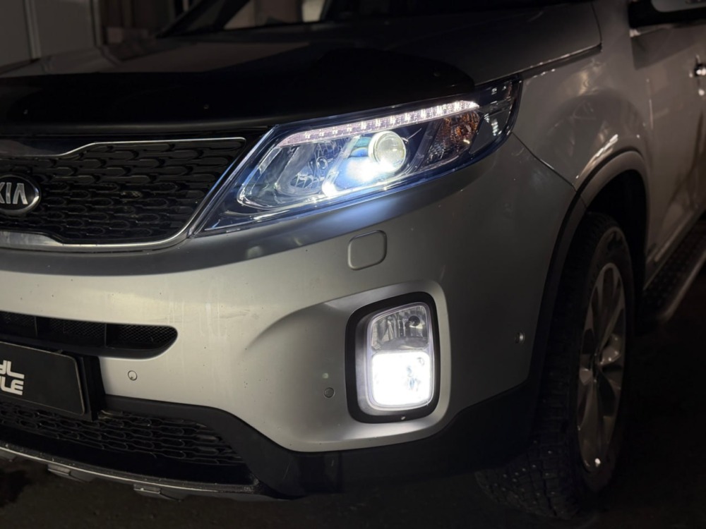 С завода на этом Kia Sorento стоит адаптивный ксенон. Мы же установили bi-led модули от компании Aozoom K3 Dragon Knight. Разница в освещении просто потрясающая!