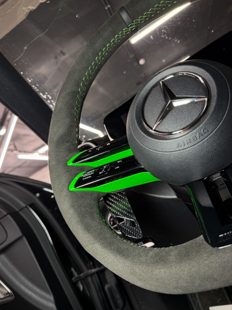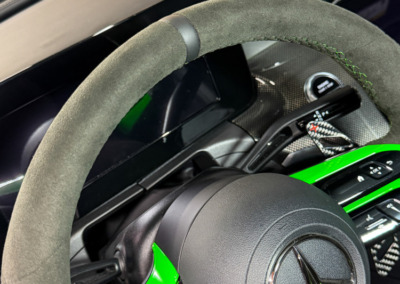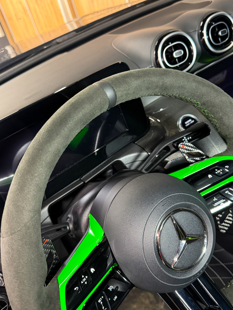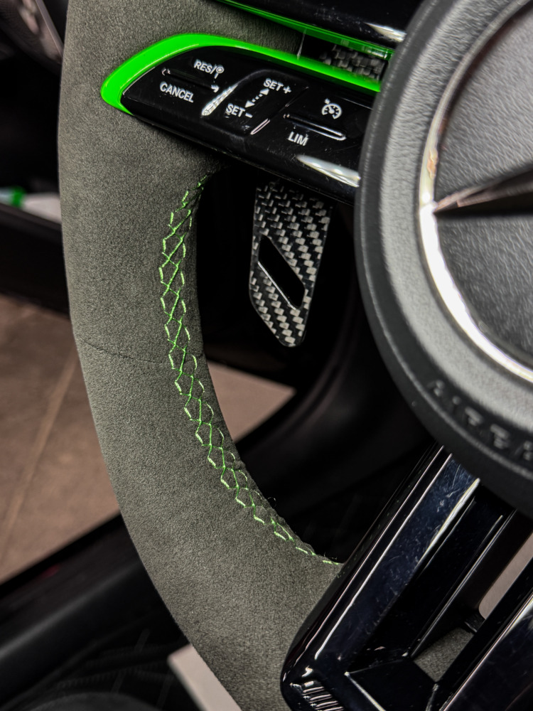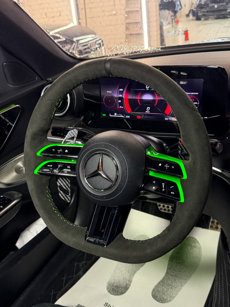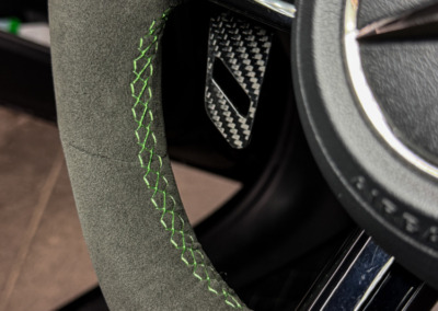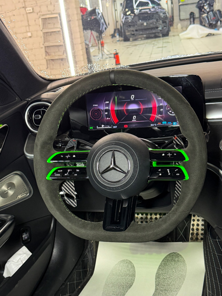 — перетяжка руля в алькантару с кожаной нулевой меткой и контрастной нитью