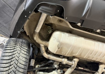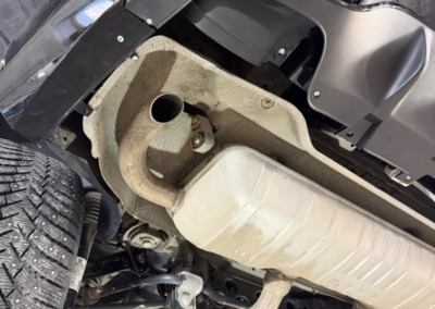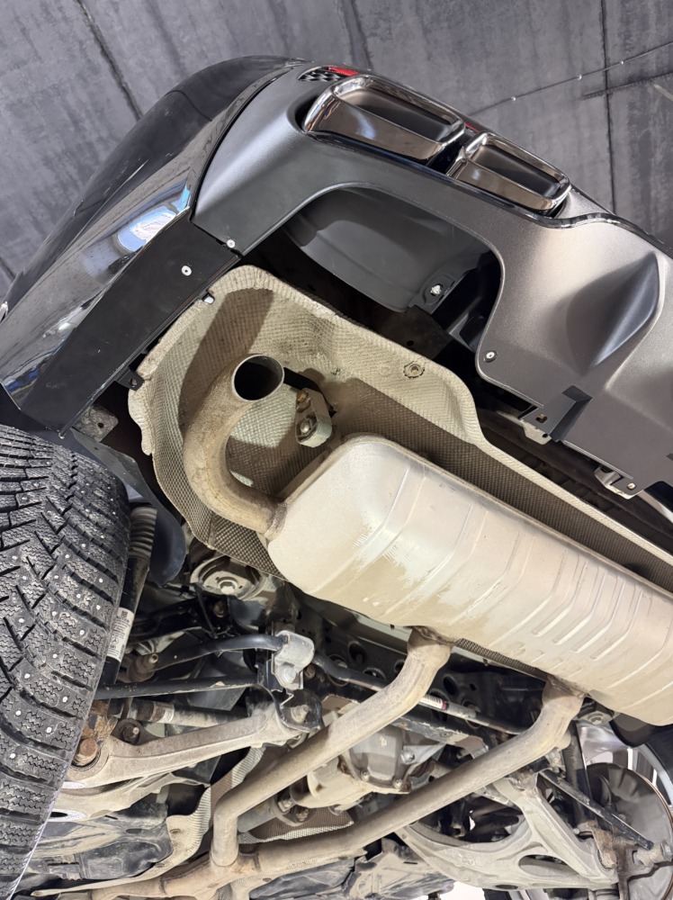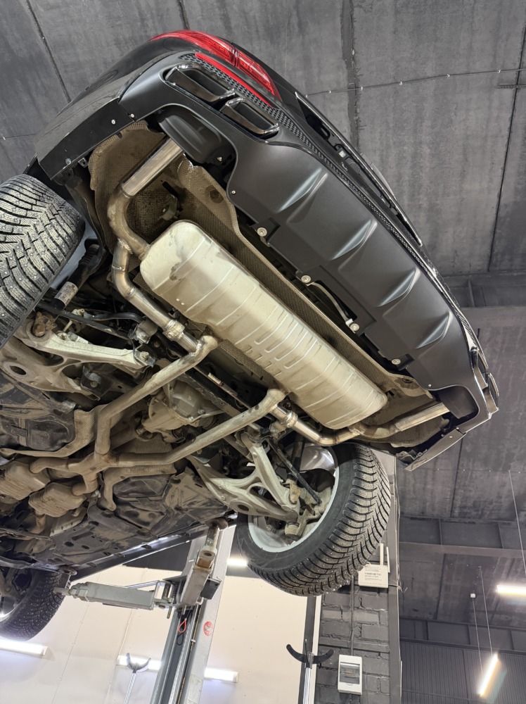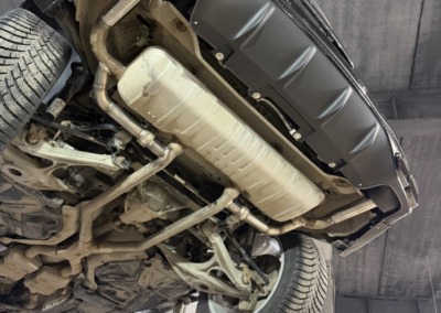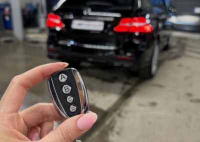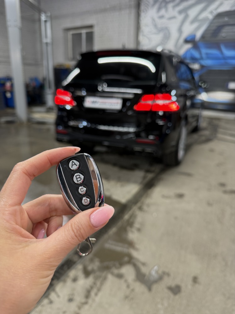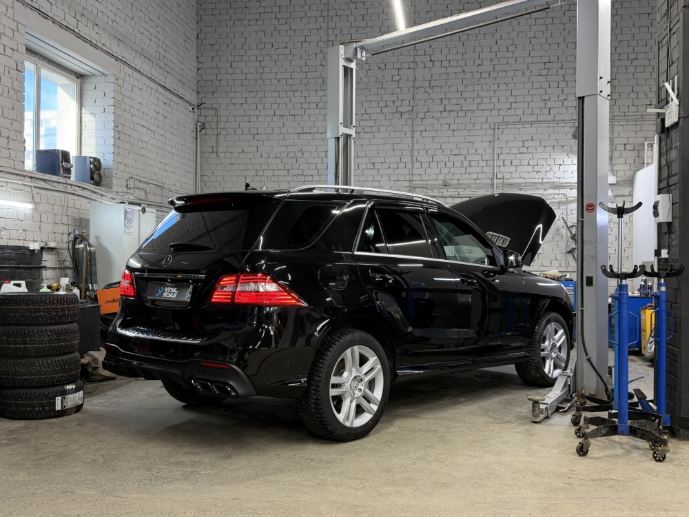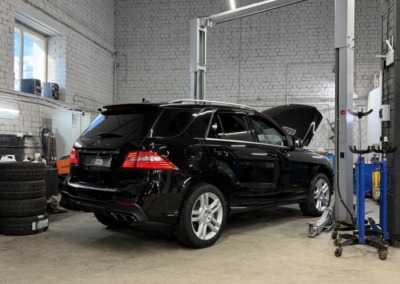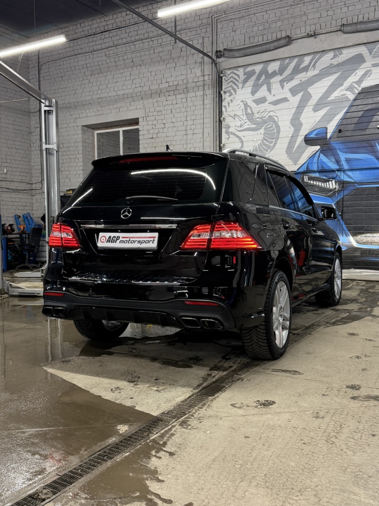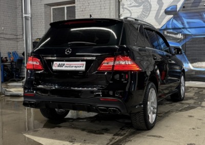 На Mercedes ML 350 мы заменили задний диффузор, аккуратно вывели выхлопные трубы к насадкам и установили управляемую выхлопную систему с заслонками.