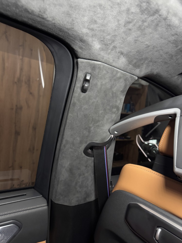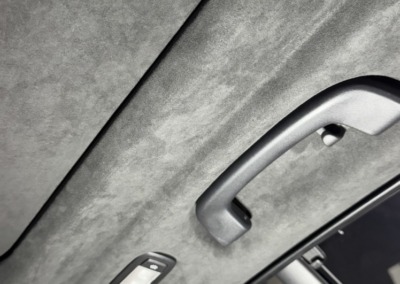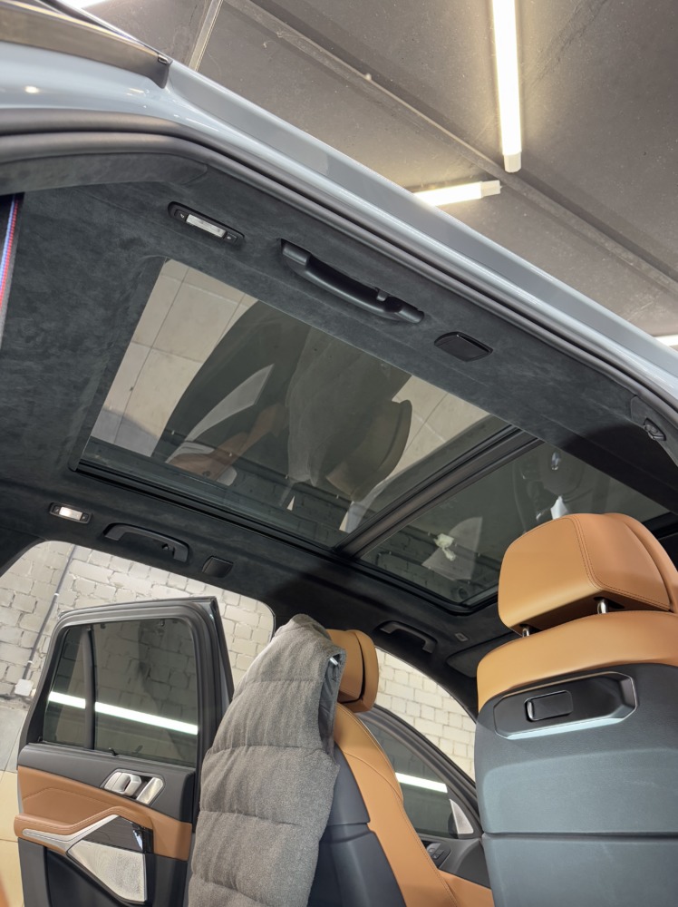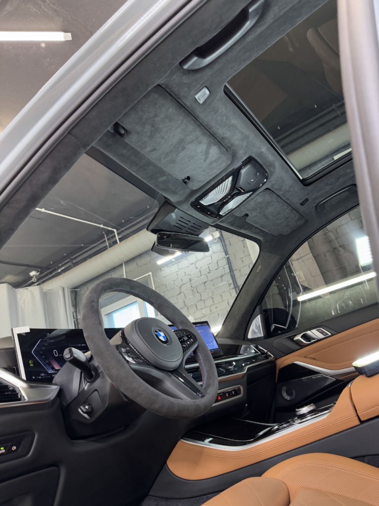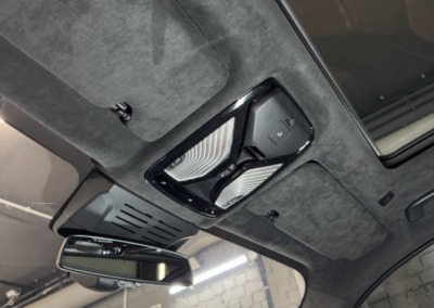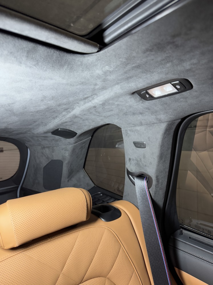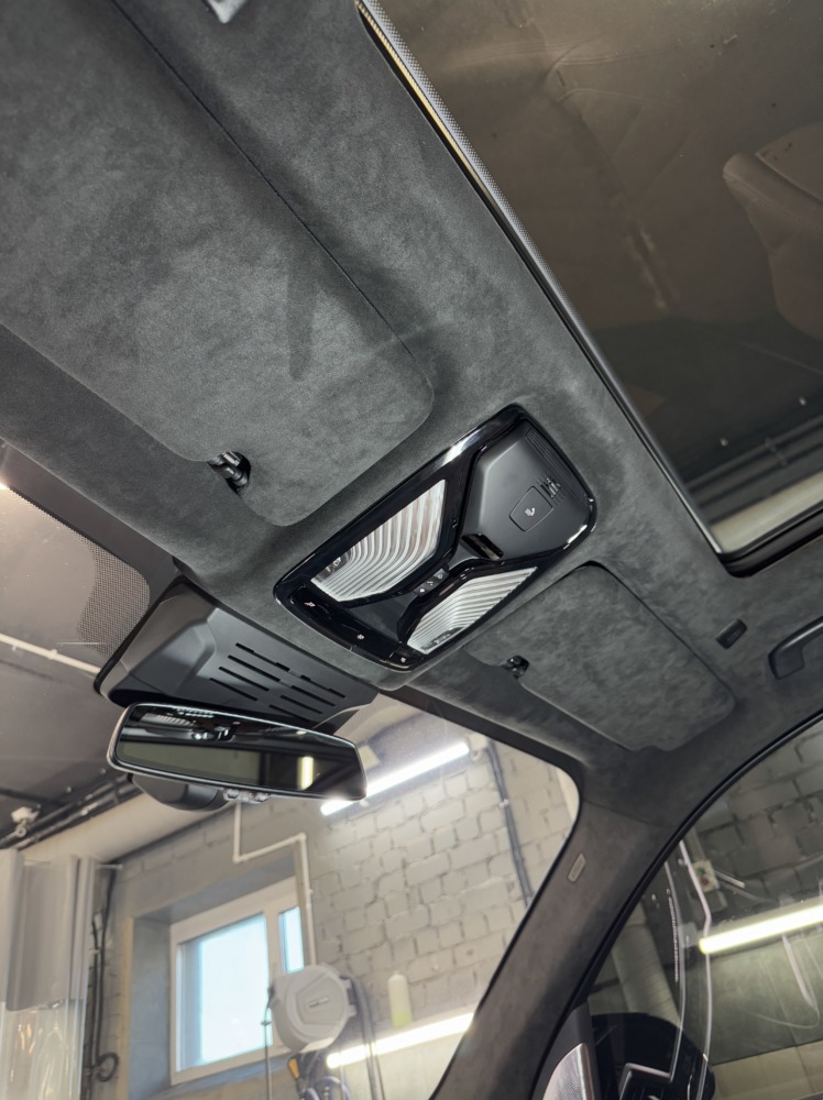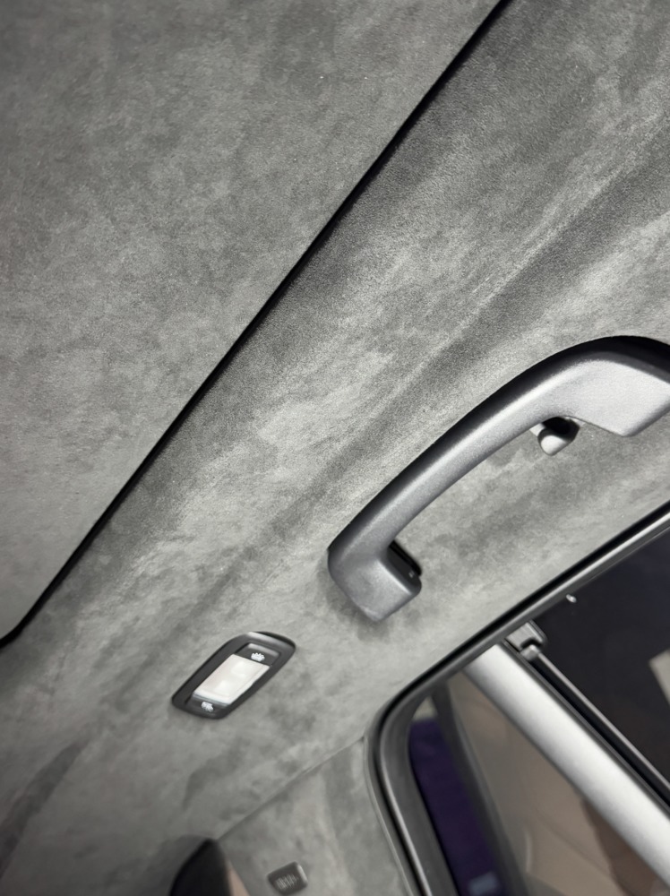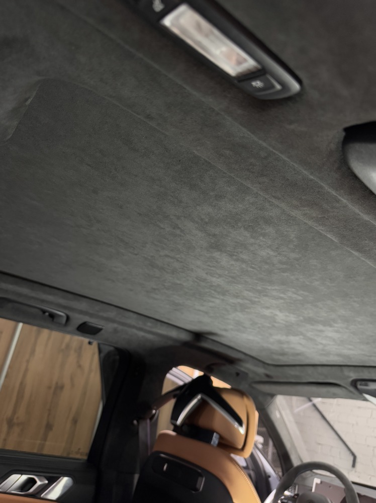 На BMW X5 перешили потолок в алькантару цвета антрацит. Выглядит это так, как должно было быть с завода, с этим цветом салона он выглядит просто безупречно. Помимо потолка, перетянуты были шторка, стойки и козырьки.
