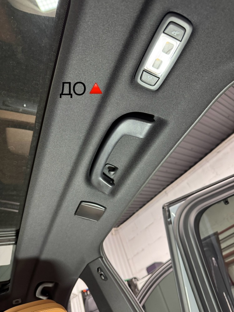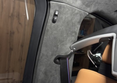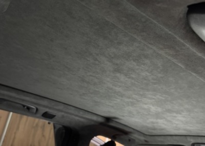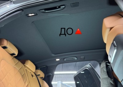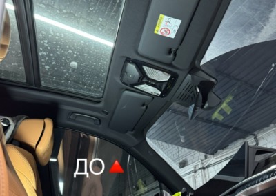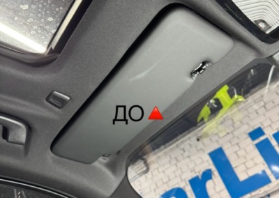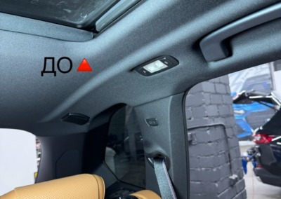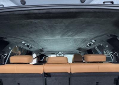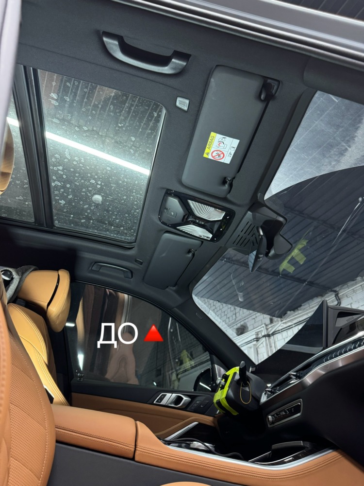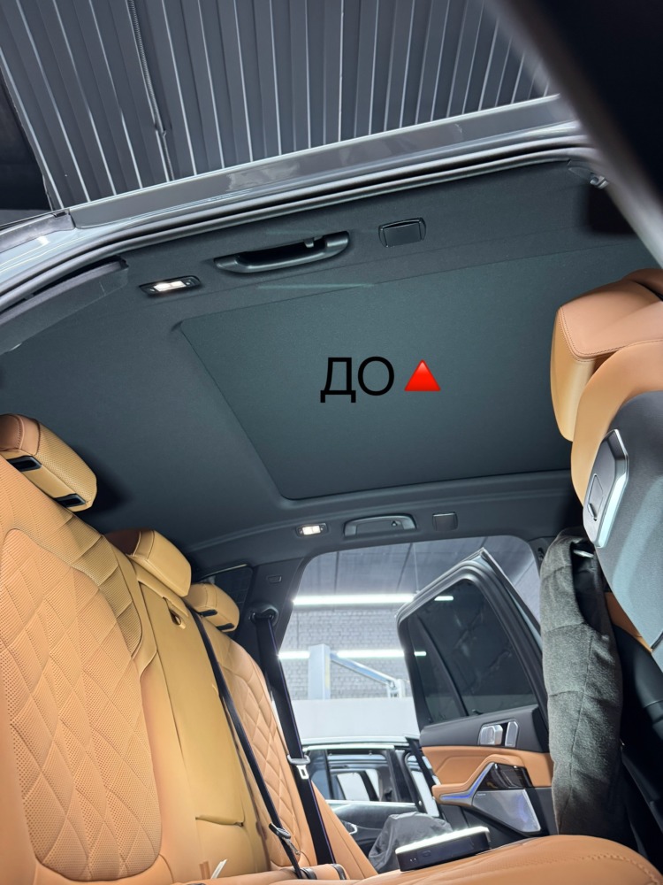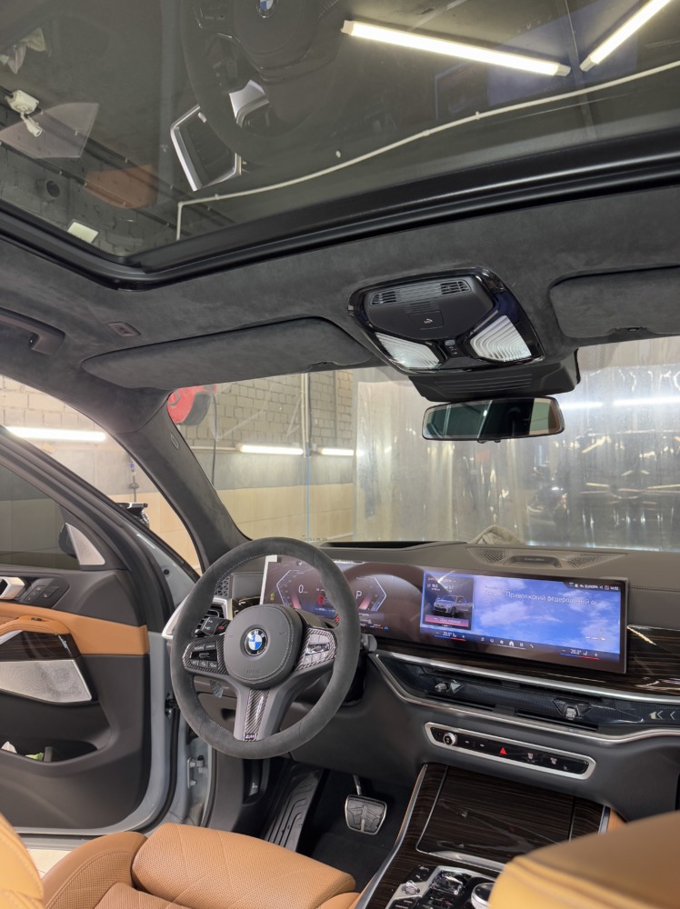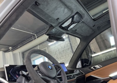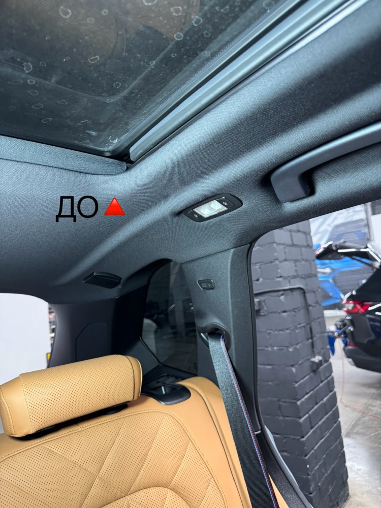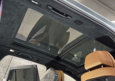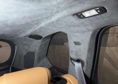 На BMW X5 перешили потолок в алькантару цвета антрацит. Выглядит это так, как должно было быть с завода, с этим цветом салона он выглядит просто безупречно. Помимо потолка, перетянуты были шторка, стойки и козырьки.