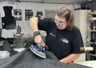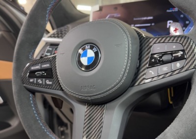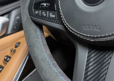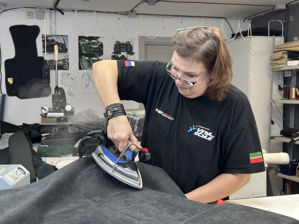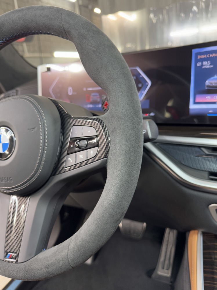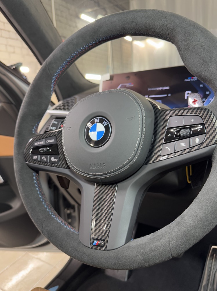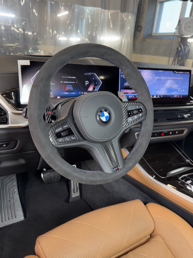 И, само собой, руль стоковым остаться не мог. Мы также перетянули его в алькантару цвета антрацит, сделали аквапринт на вставках в руле и лепестках.