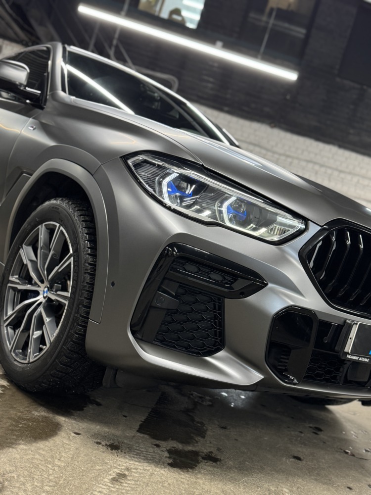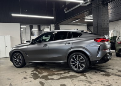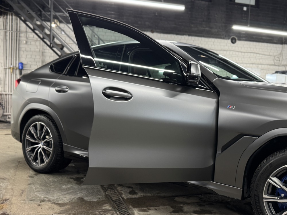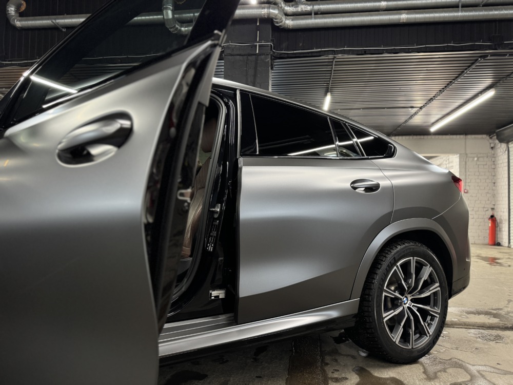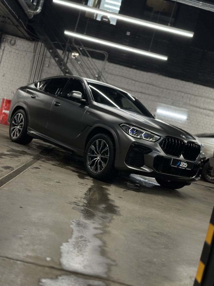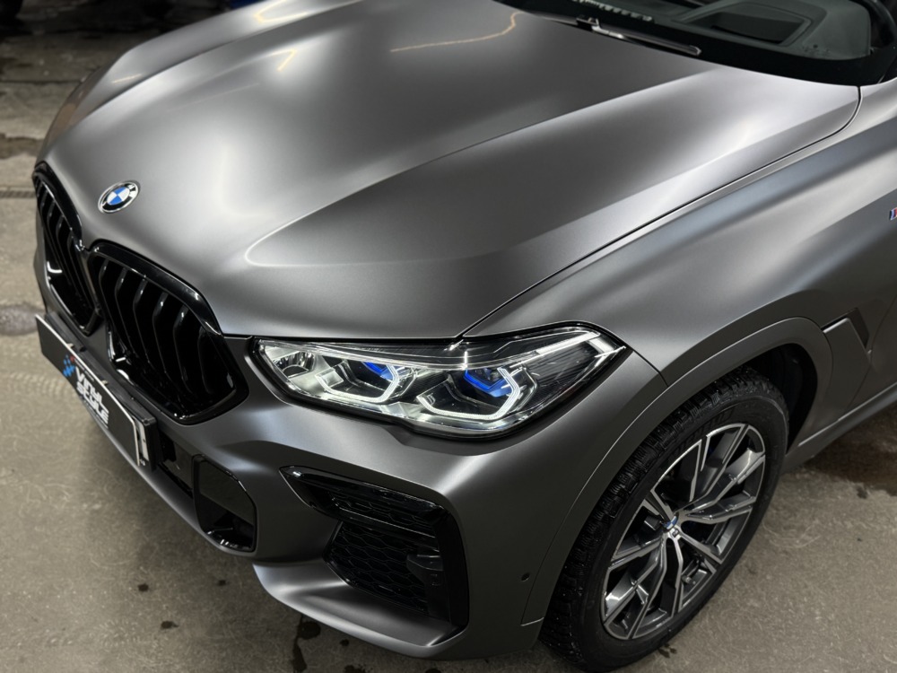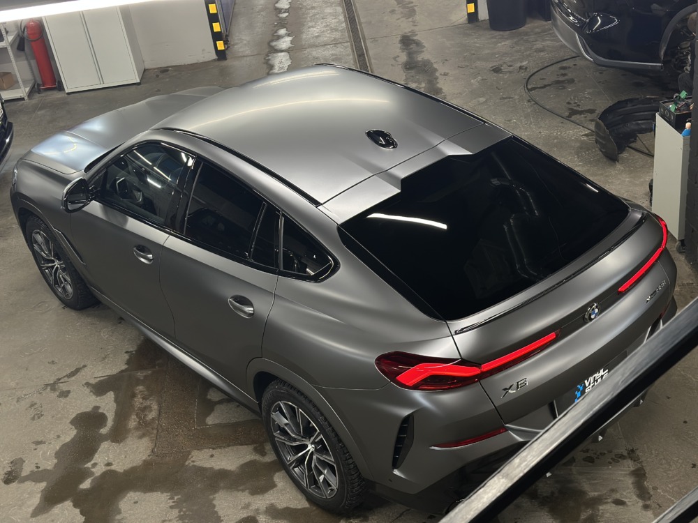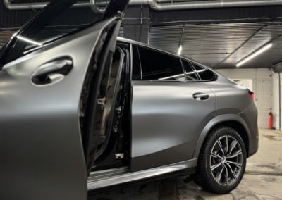 Смена цвета BMW X6. Необычный оттенок плёнки моментально притягивает взгляды и одновременно защищает кузов от сколов, царапин и всей городской агрессии.