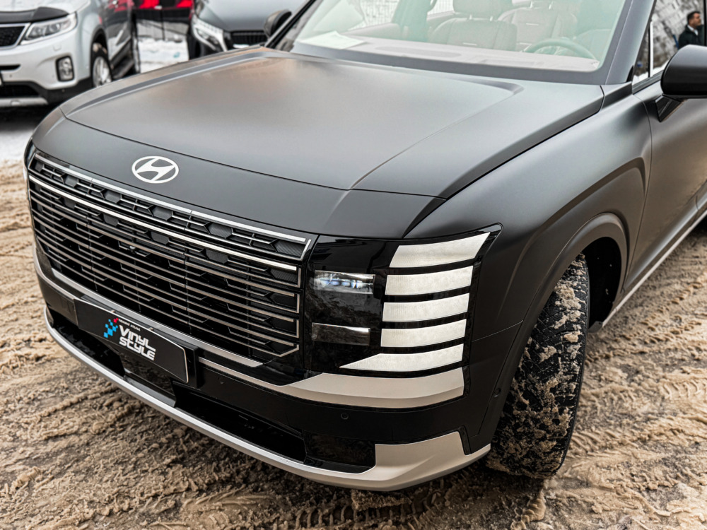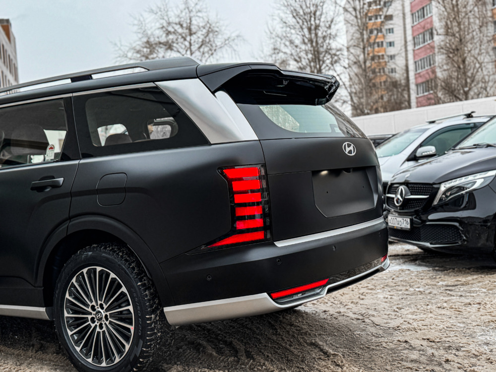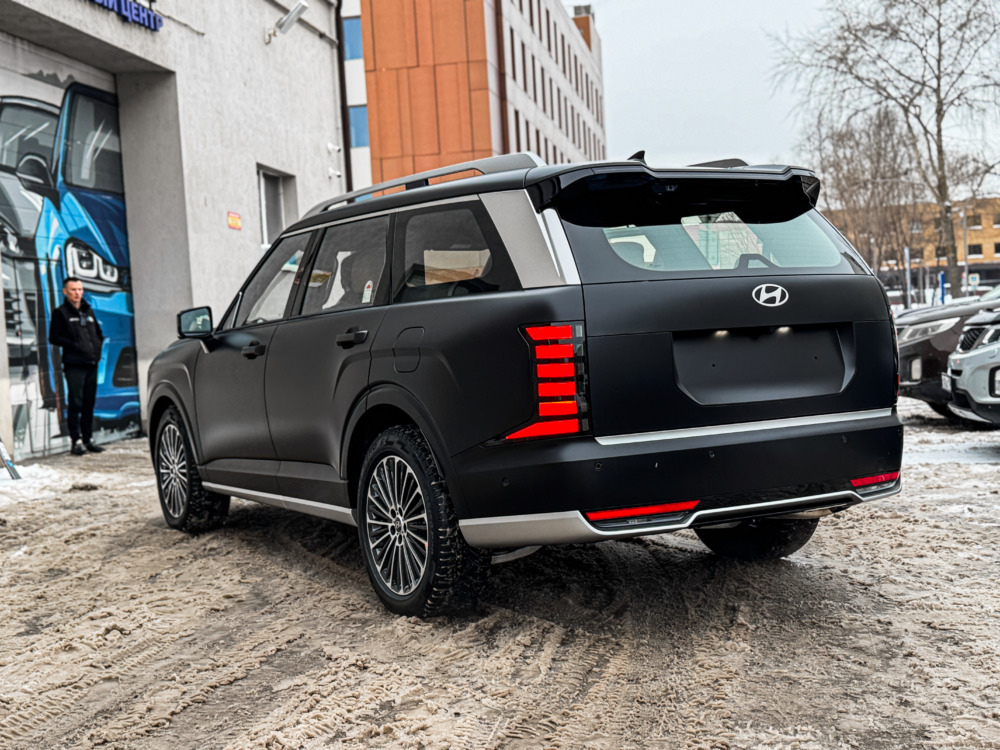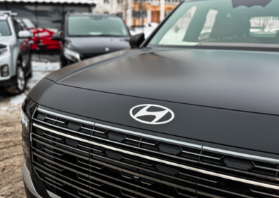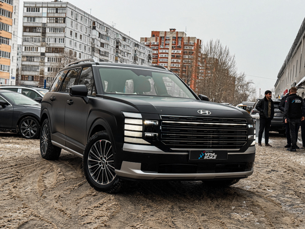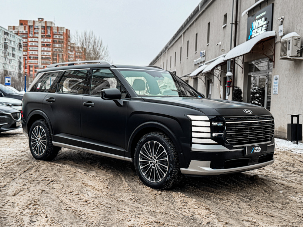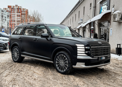 Hyundai Palisade, оклеенный матовой полиуретановой плёнкой. Теперь автомобилю не страшны мелкие повреждения, а выглядит он при этом ещё более солидно.