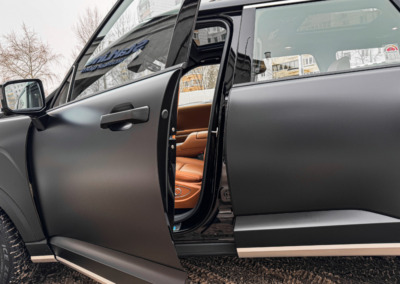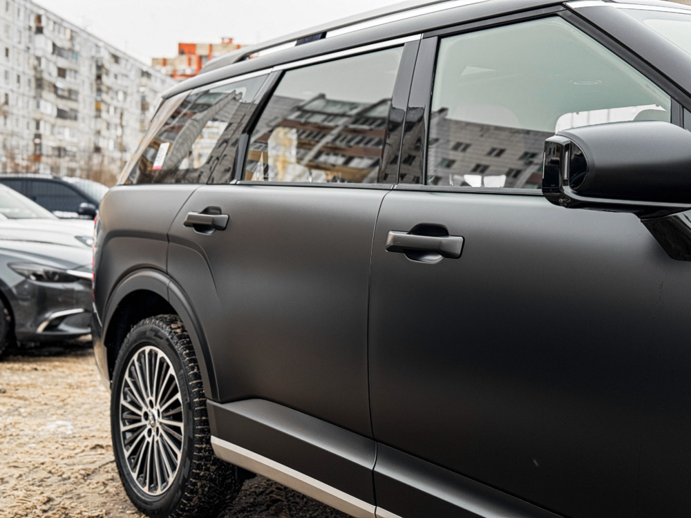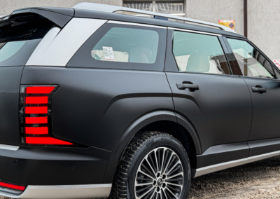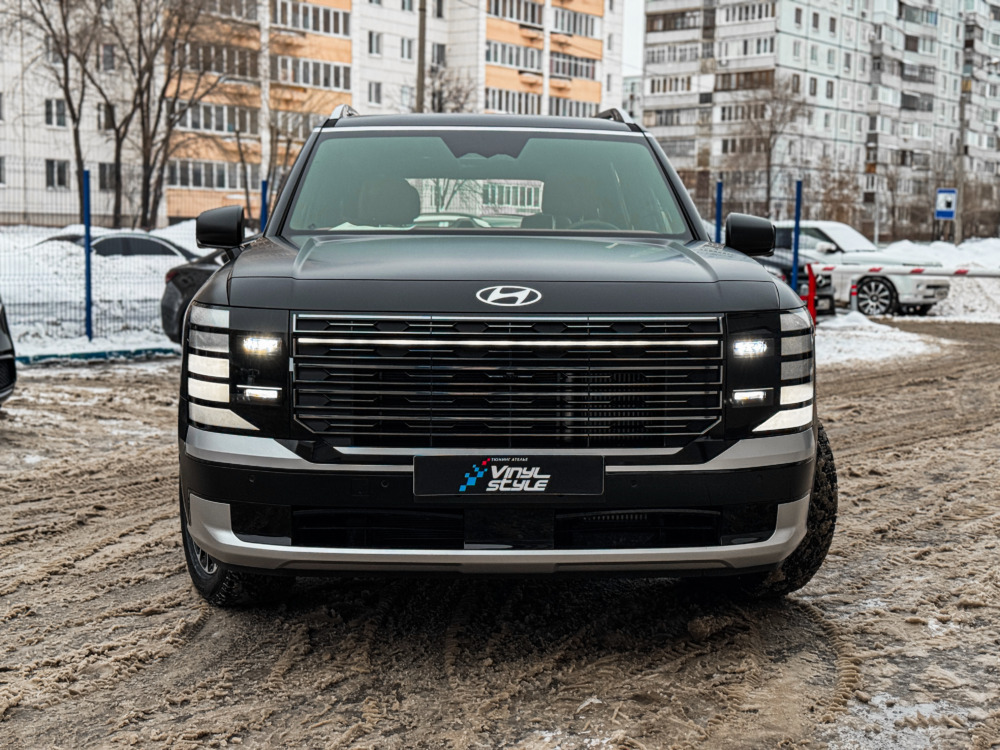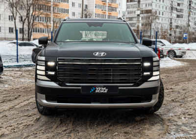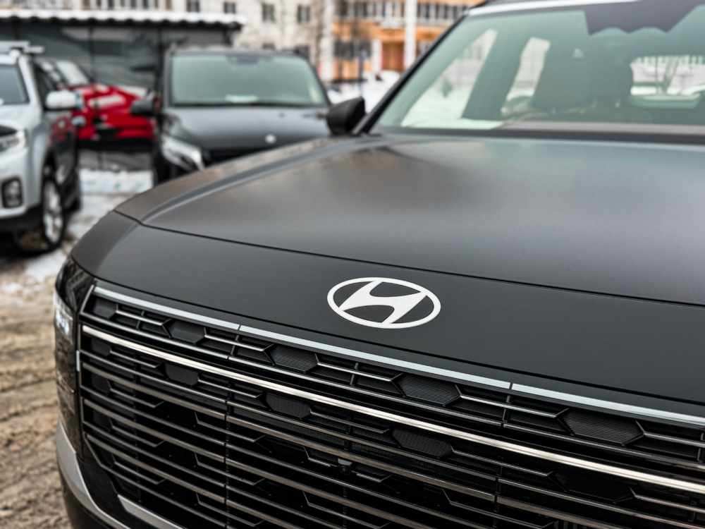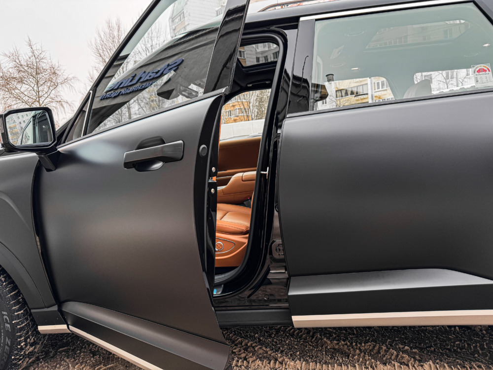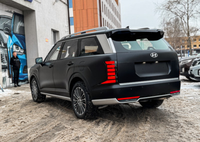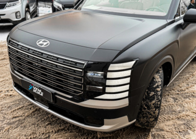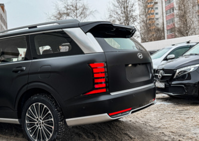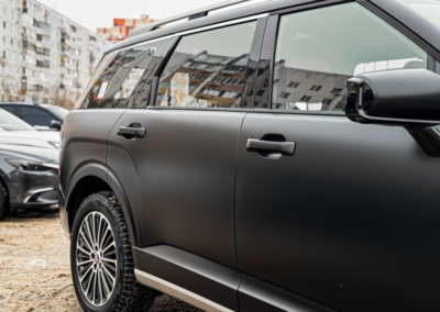Hyundai Palisade, оклеенный матовой полиуретановой плёнкой. Теперь автомобилю не страшны мелкие повреждения, а выглядит он при этом ещё более солидно.
