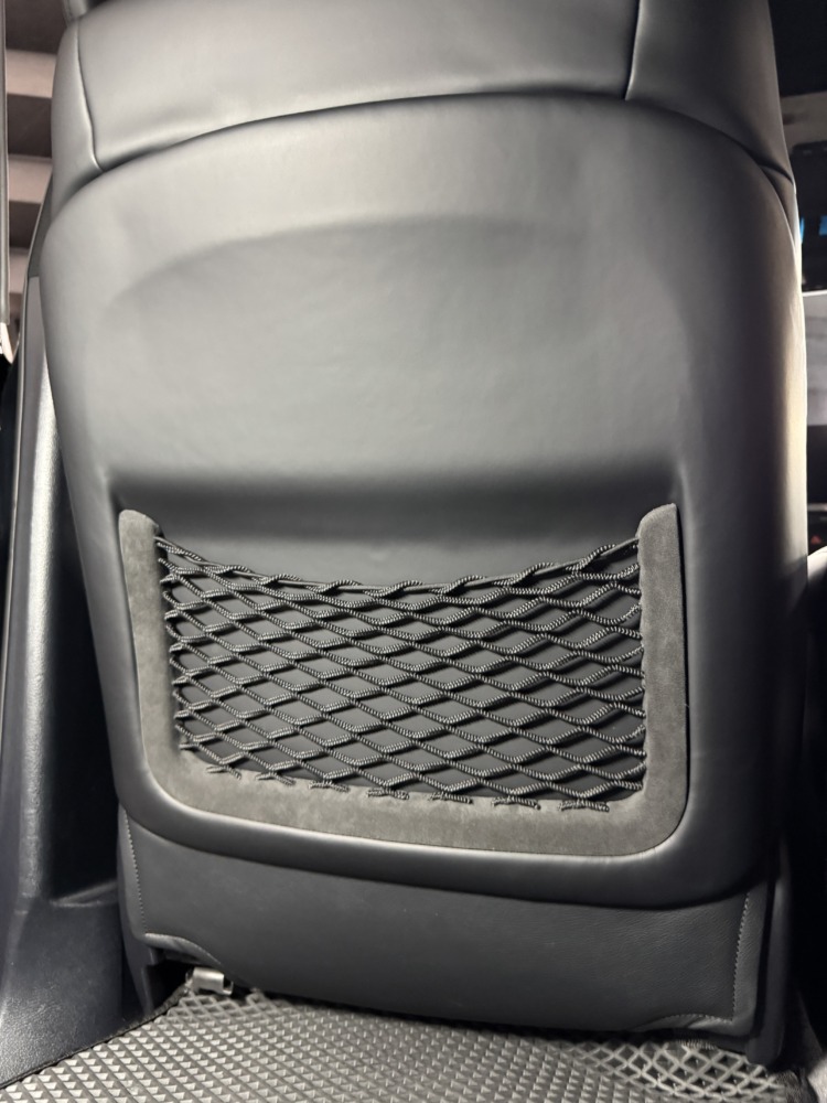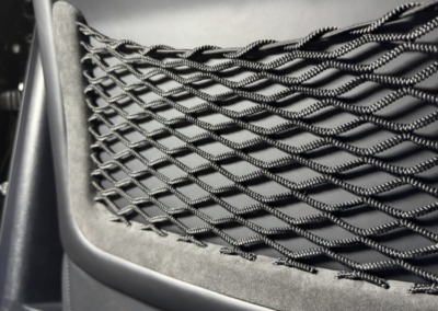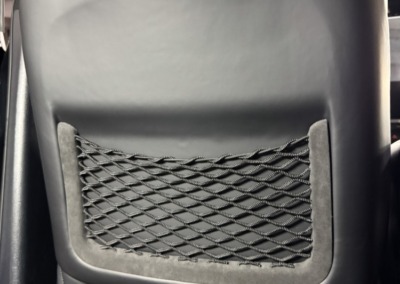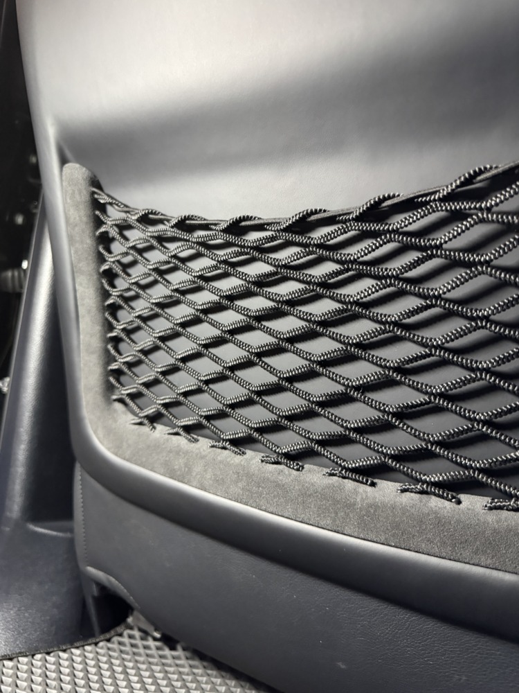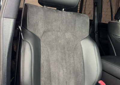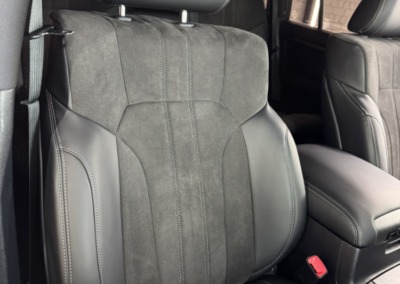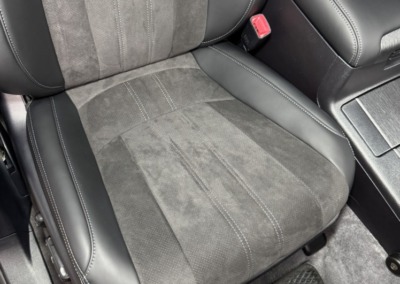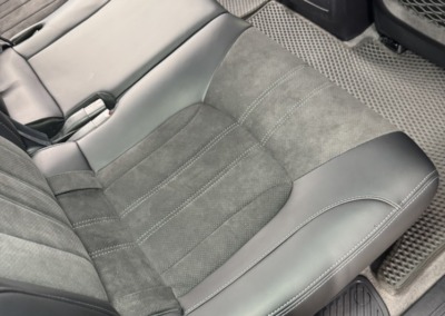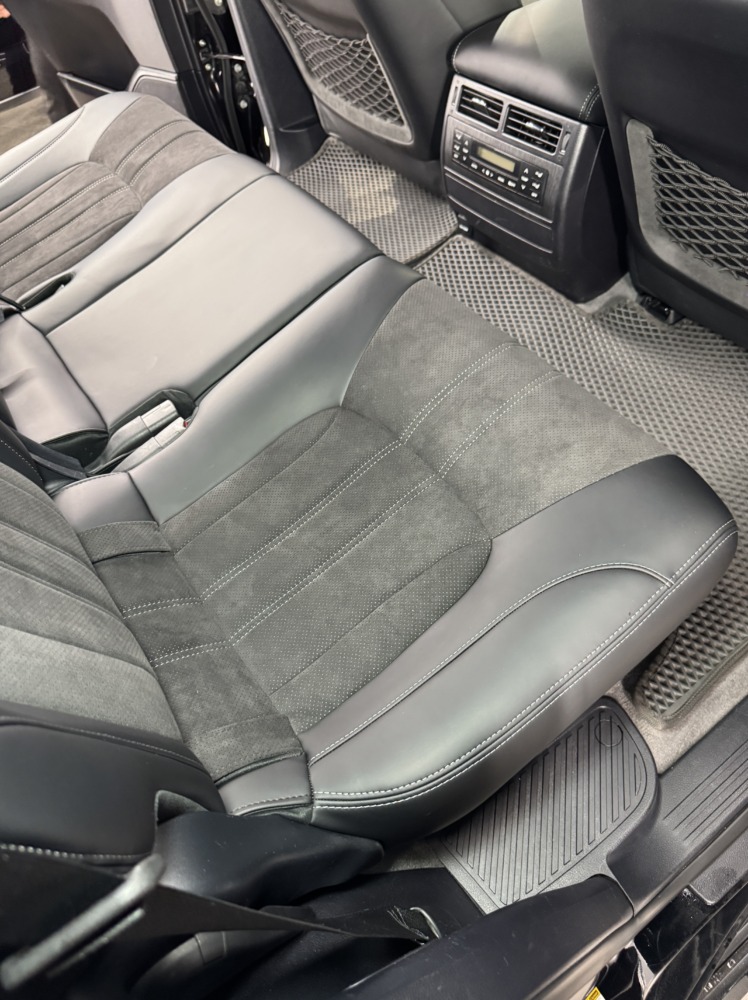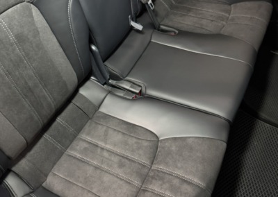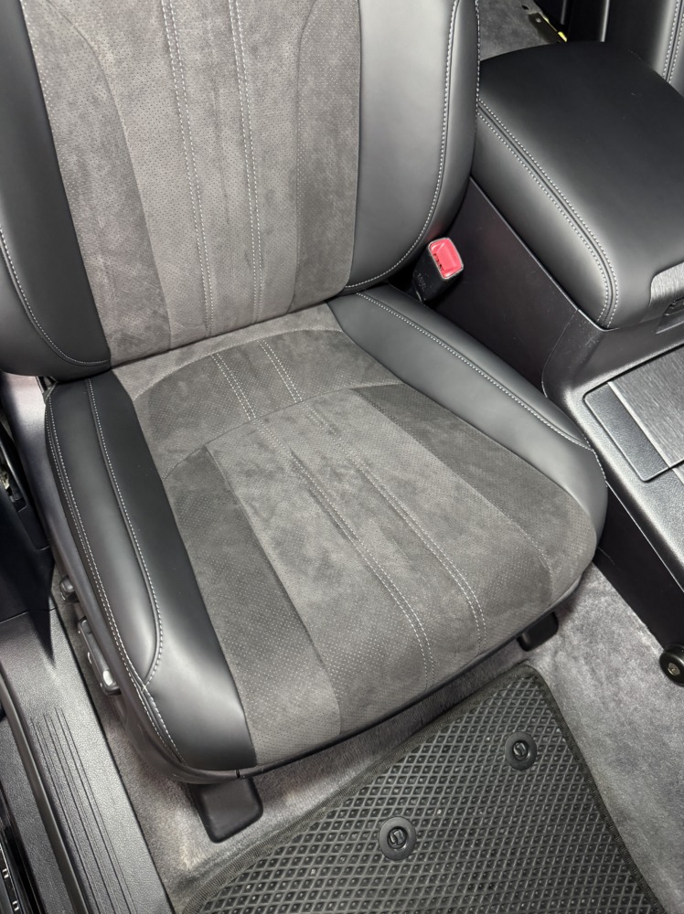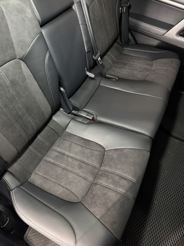 В отделке использовали выигрышную комбинацию из кожи и алькантары. Алькантара была перфорирована по специальному заказу, а нити подбирались индивидуально — вплоть до оттенка, чтобы после перешива сиденья выглядели по-настоящему премиально.