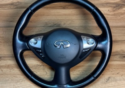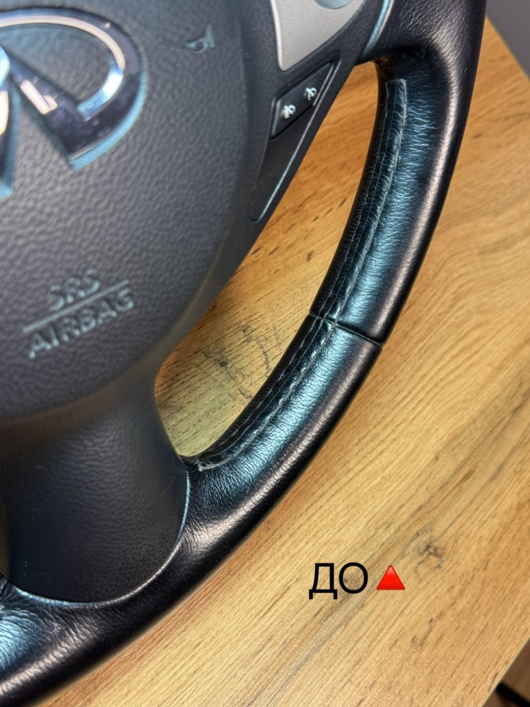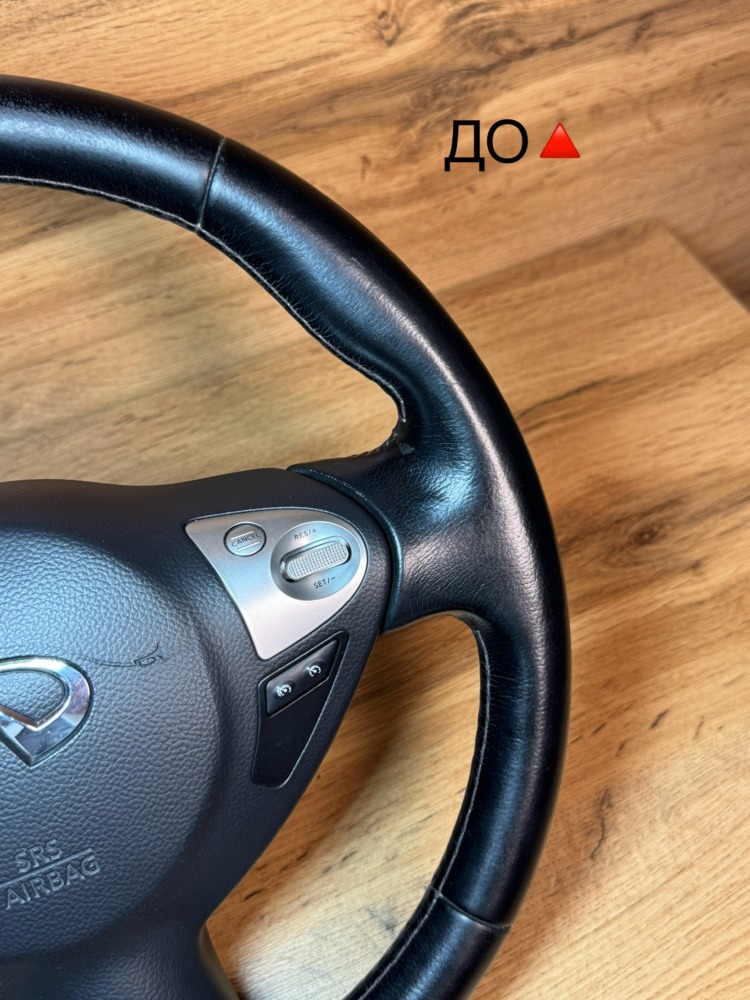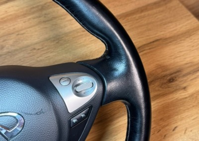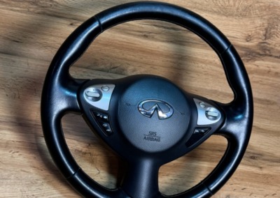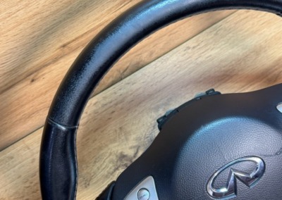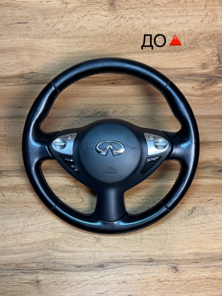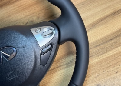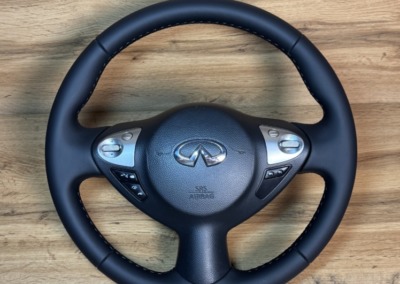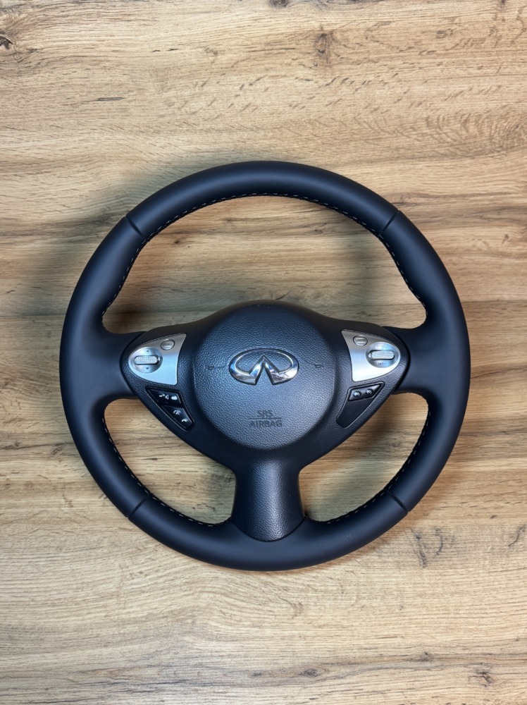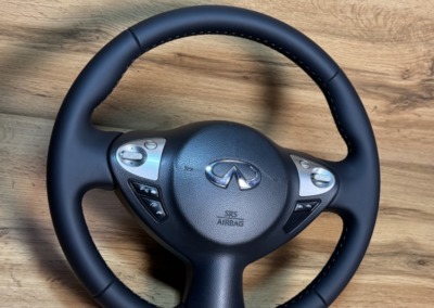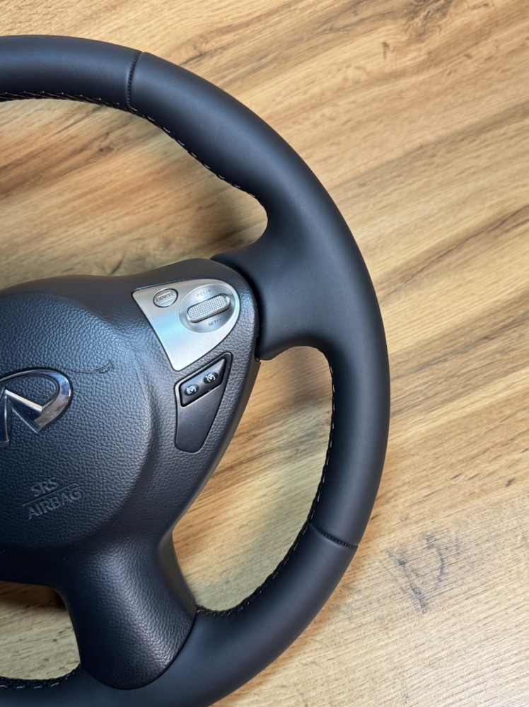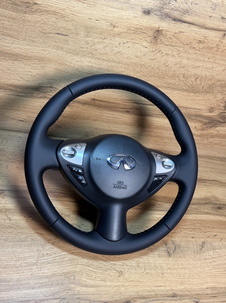 Перетяжка руля автомобиля Infiniti QX70 Руль от Infiniti QX70 перетянули в натуральную кожу, цвет нитки — антрацит.