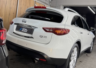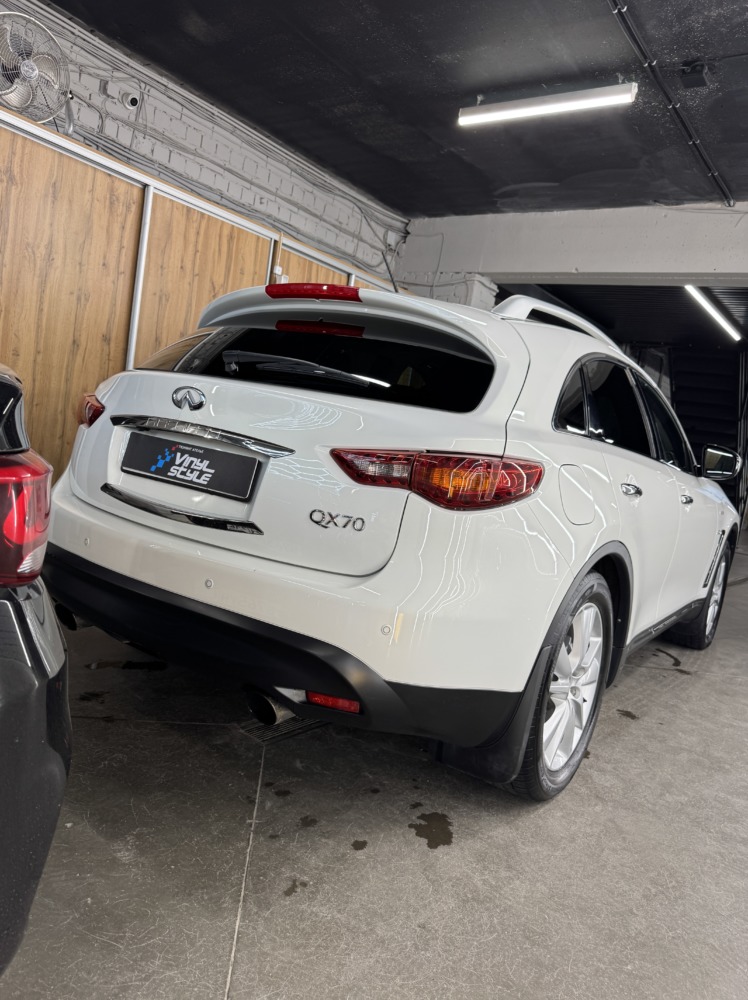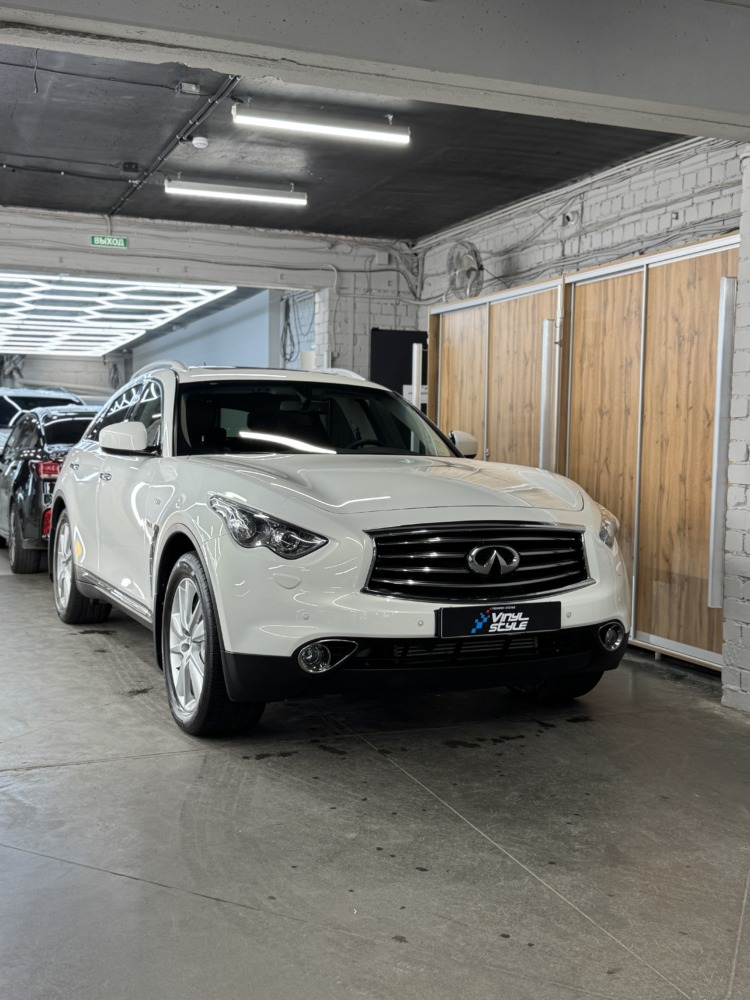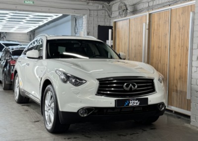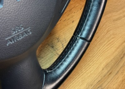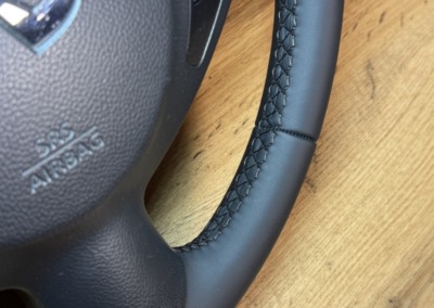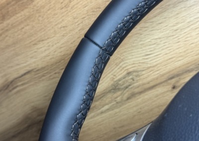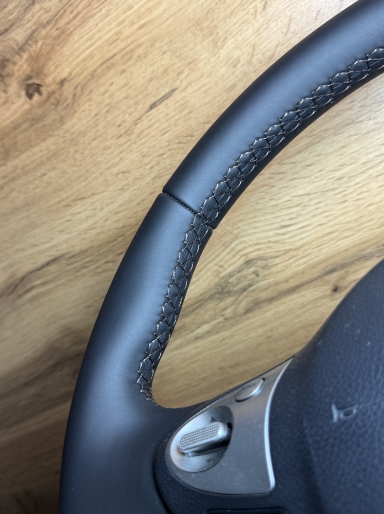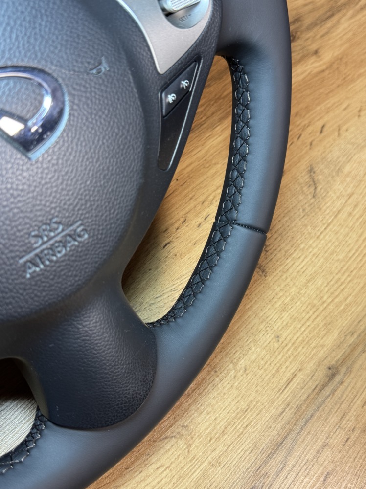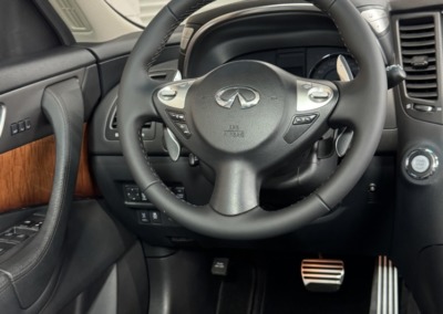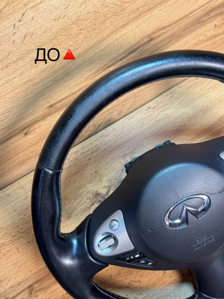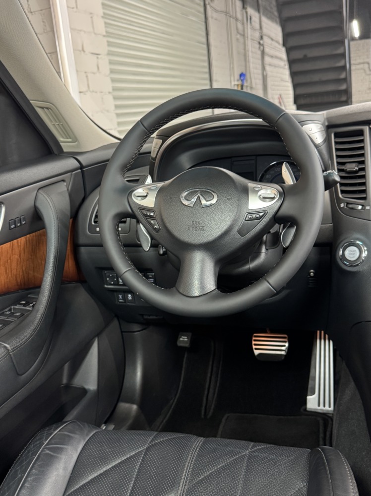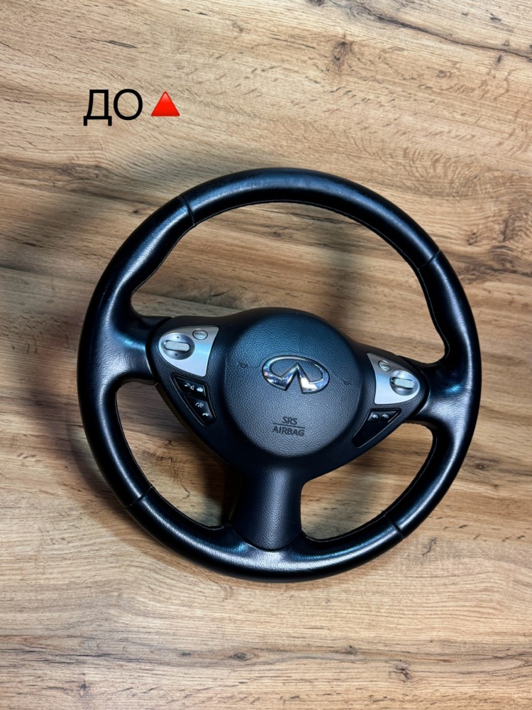 Перетяжка руля автомобиля Infiniti QX70 Руль от Infiniti QX70 перетянули в натуральную кожу, цвет нитки — антрацит.
