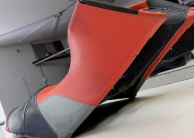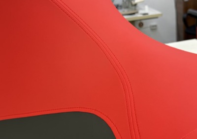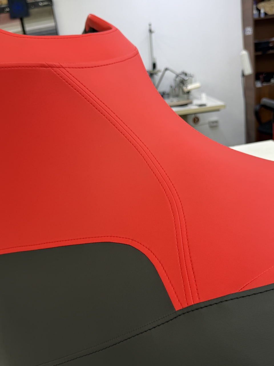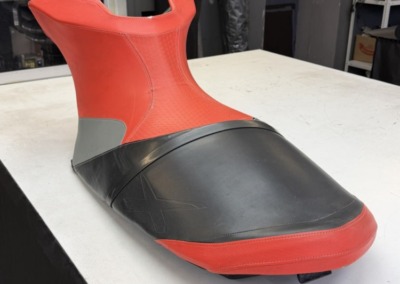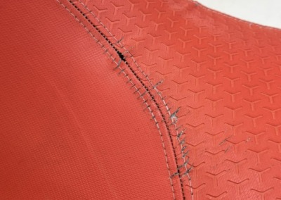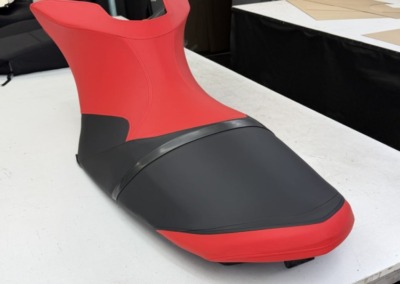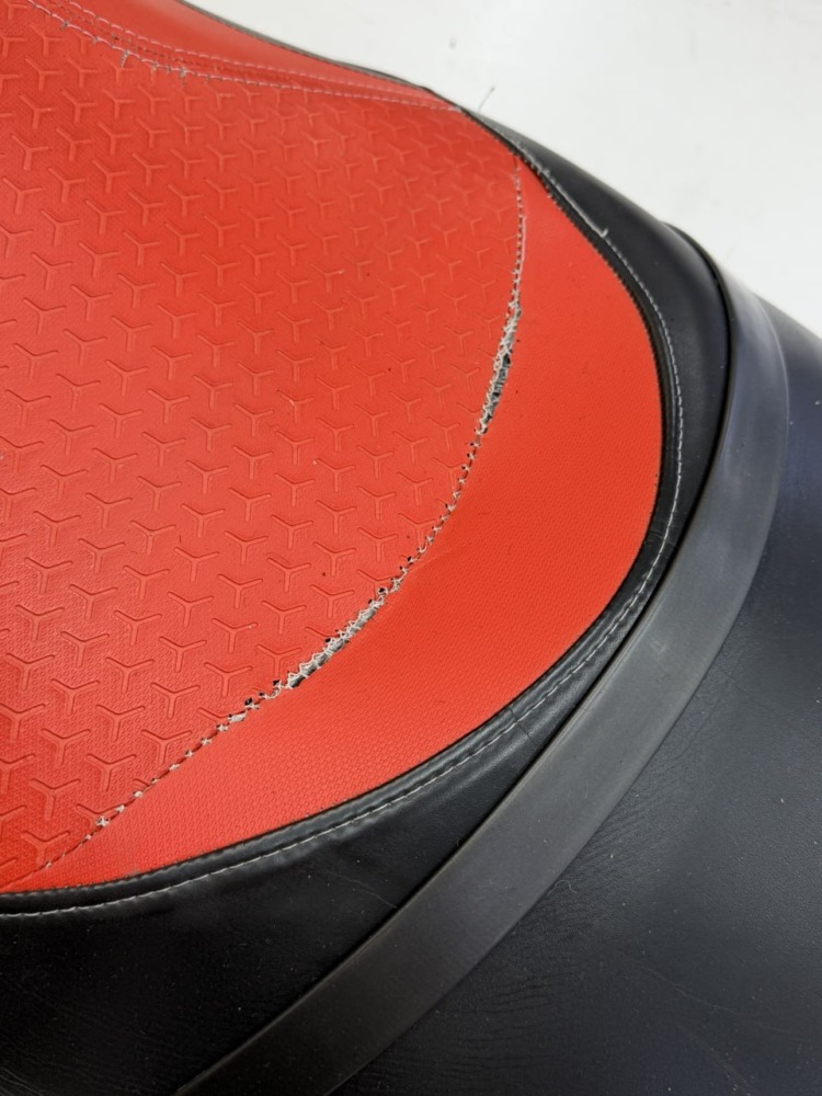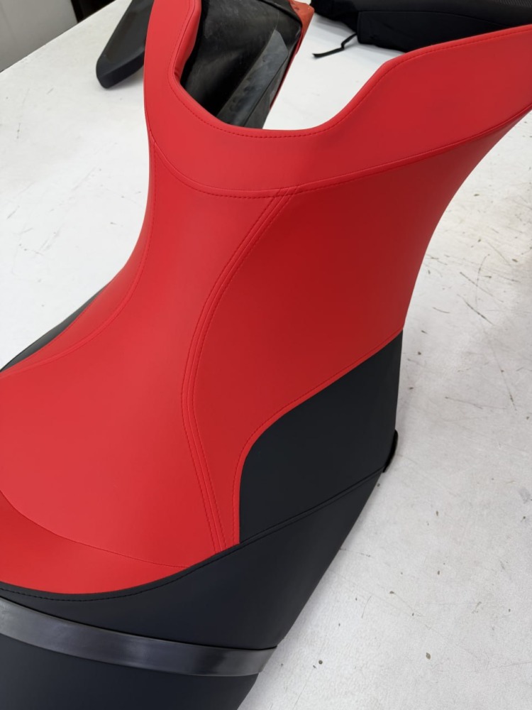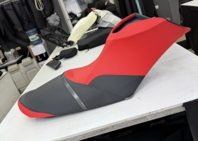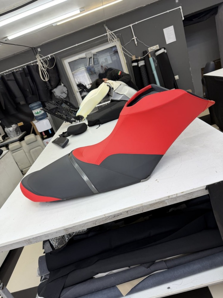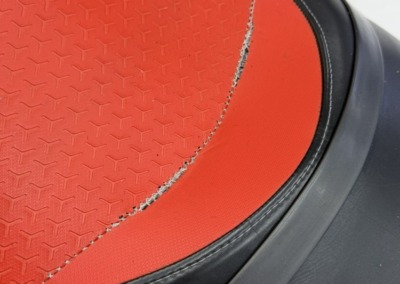 Перетяжка сиденья гидроцикла Заводская обшивка сиденья этого гидроцикла не выдержала воздействия воды: материал расползся, местами порвался. Мы полностью перетянули сидушку, освежив её внешний вид, а также заменили серые вставки на черные для повышения практичности.