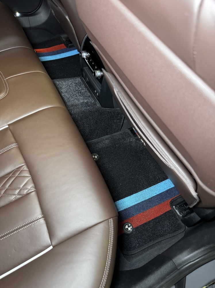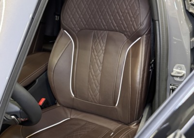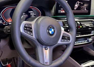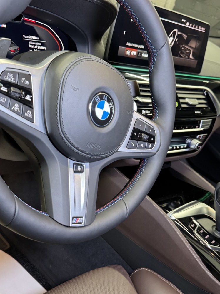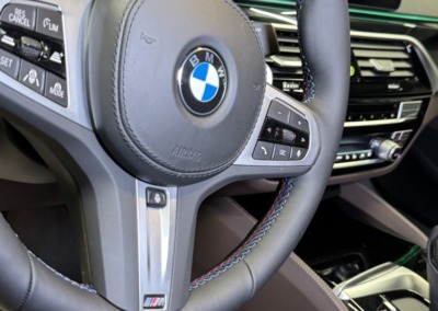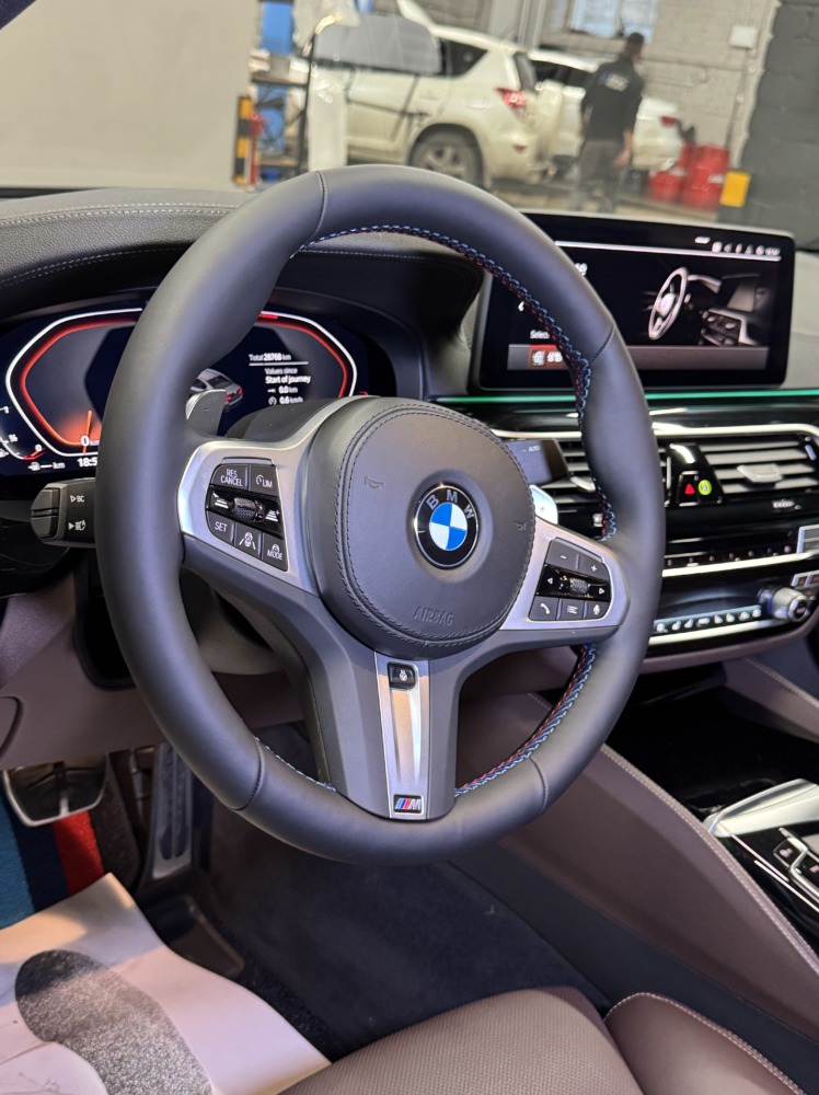 Руль перетянули натуральной кожей с добавлением М-строчки.