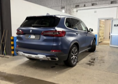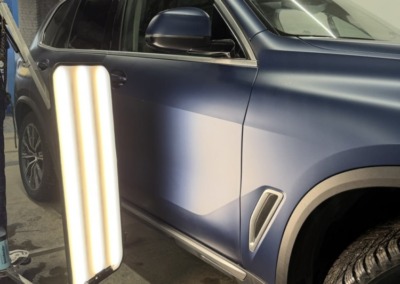 Мы выполнили ремонт двери на BMW X5, доступ к повреждённой зоне был открыт практически по всей нижней части. На первый взгляд это должно было облегчить работу, но сами вмятины оказались крайне сложными: металл был сильно растянут, а повреждения — «жёсткими» и капризными в выправлении.