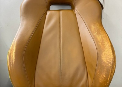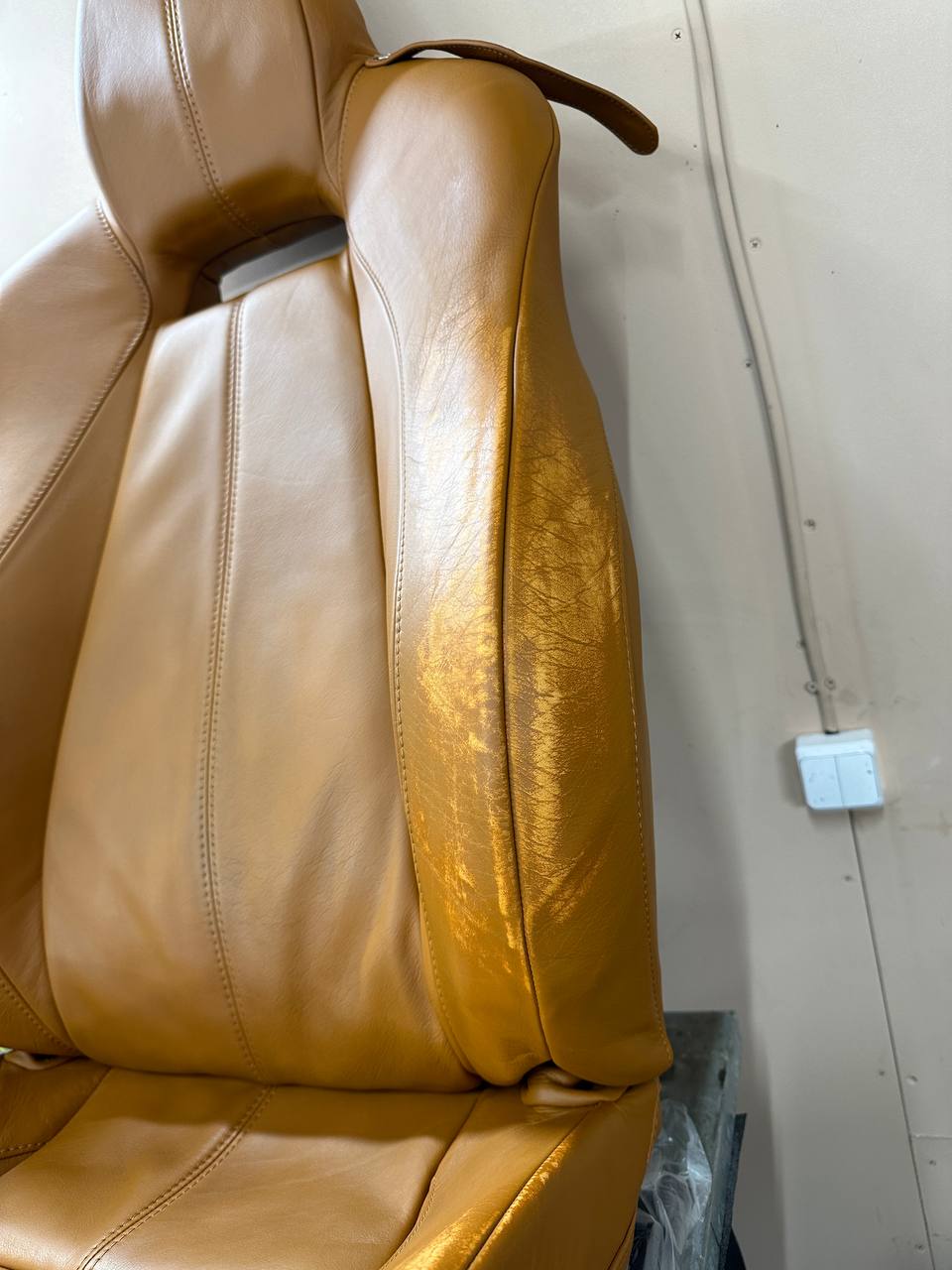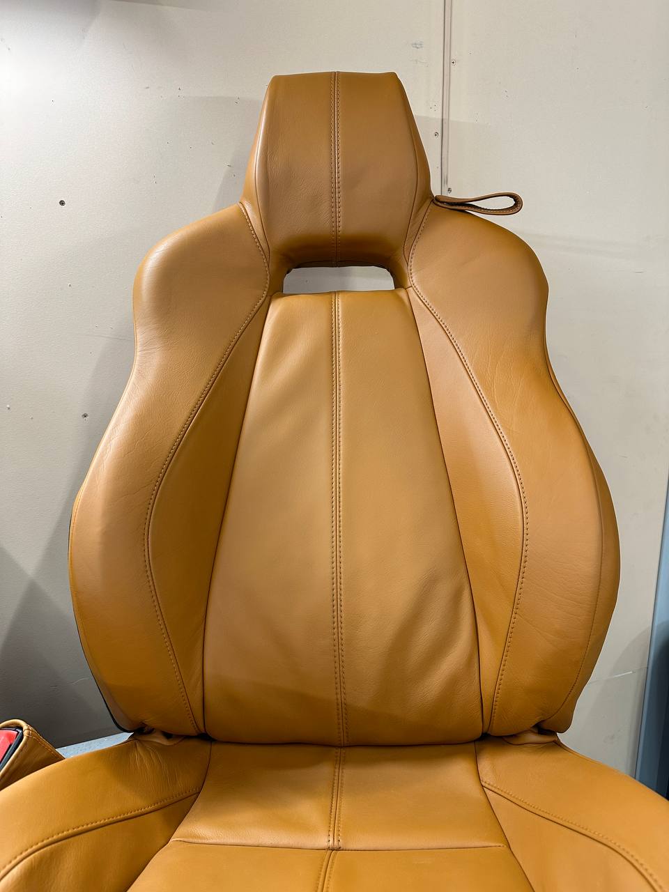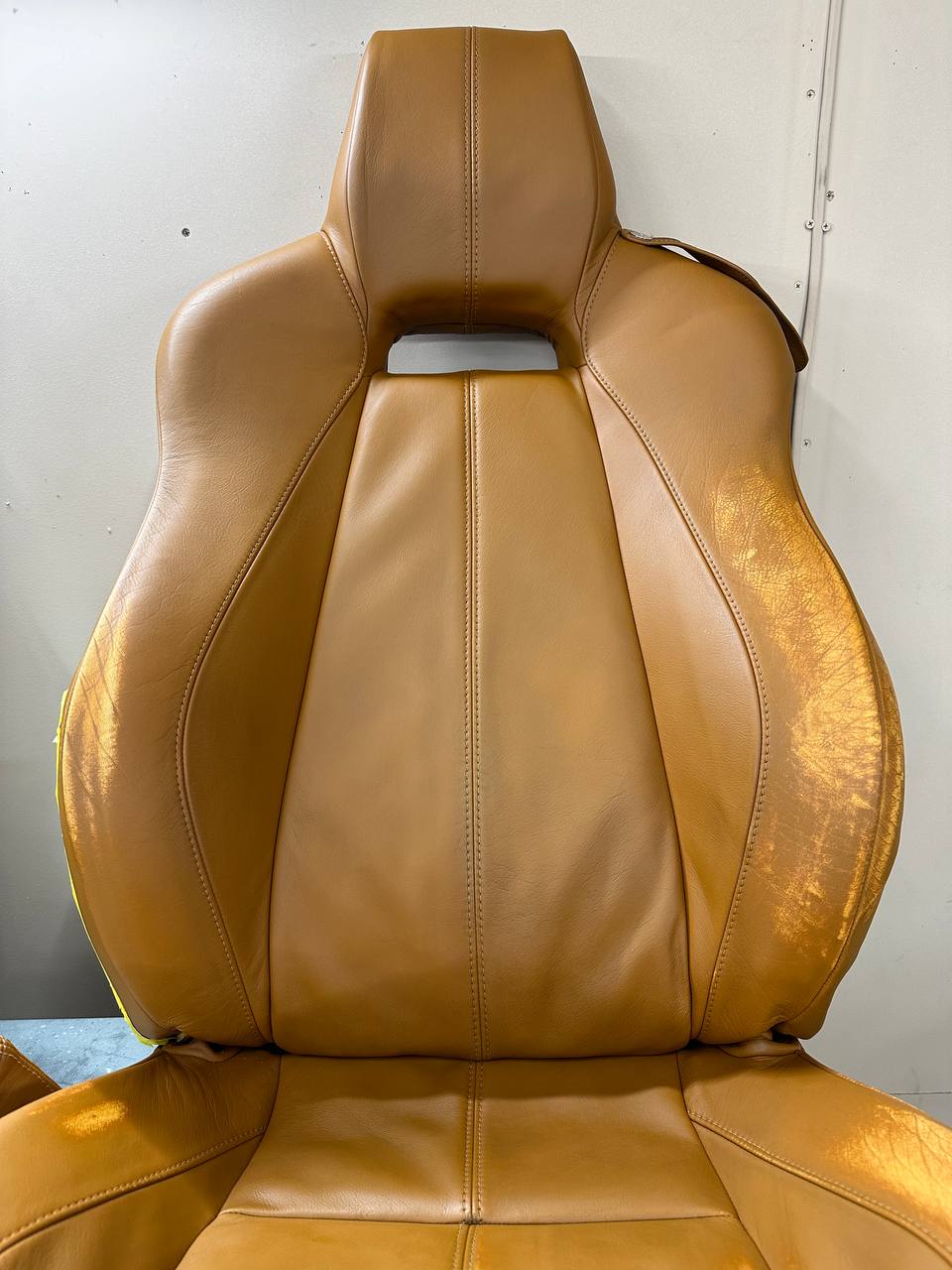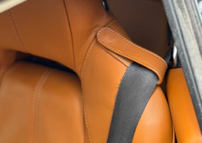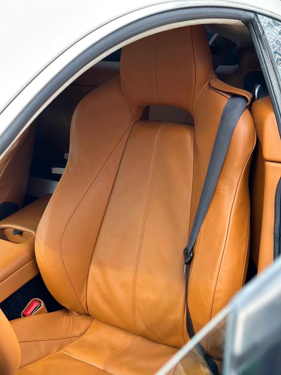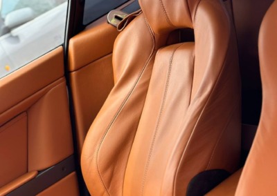 Все рыжие элементы салона были отреставрированы, тщательно подготовлены и окрашены заново — теперь оттенок выглядит глубже, чище и благороднее, подчёркивая спортивный характер автомобиля. Особое внимание уделили каждой детали: от фактуры поверхности до равномерности покрытия.