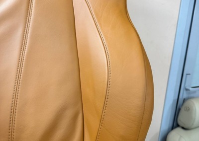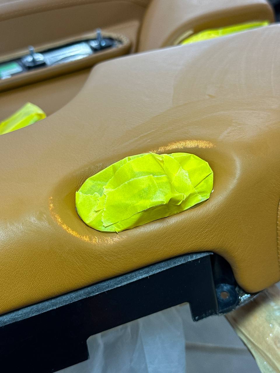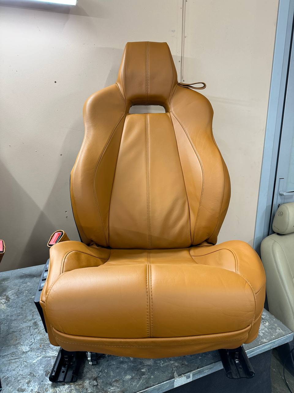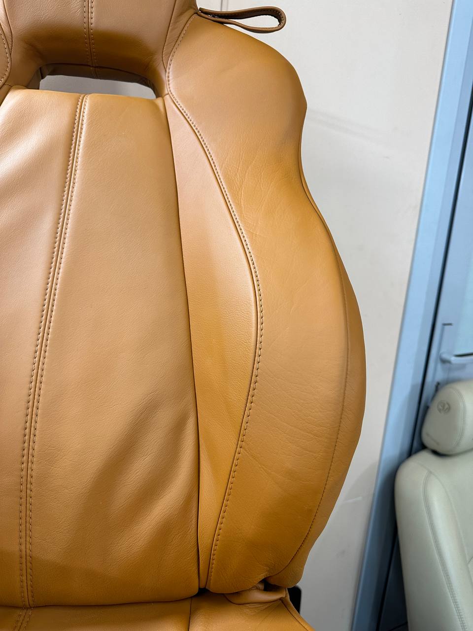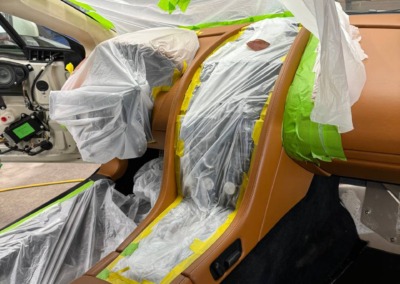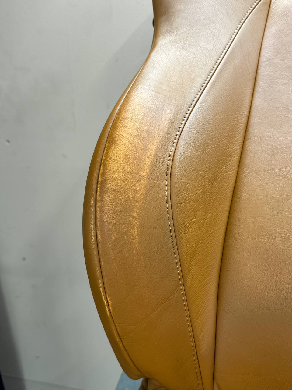 Все рыжие элементы салона были отреставрированы, тщательно подготовлены и окрашены заново — теперь оттенок выглядит глубже, чище и благороднее, подчёркивая спортивный характер автомобиля. Особое внимание уделили каждой детали: от фактуры поверхности до равномерности покрытия.