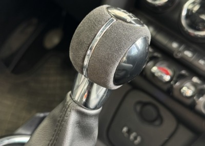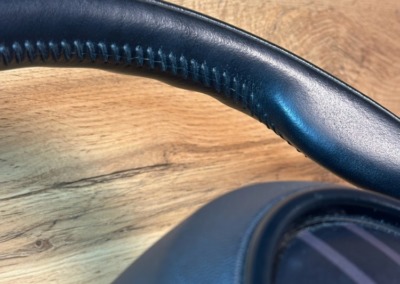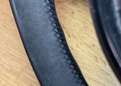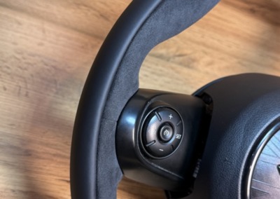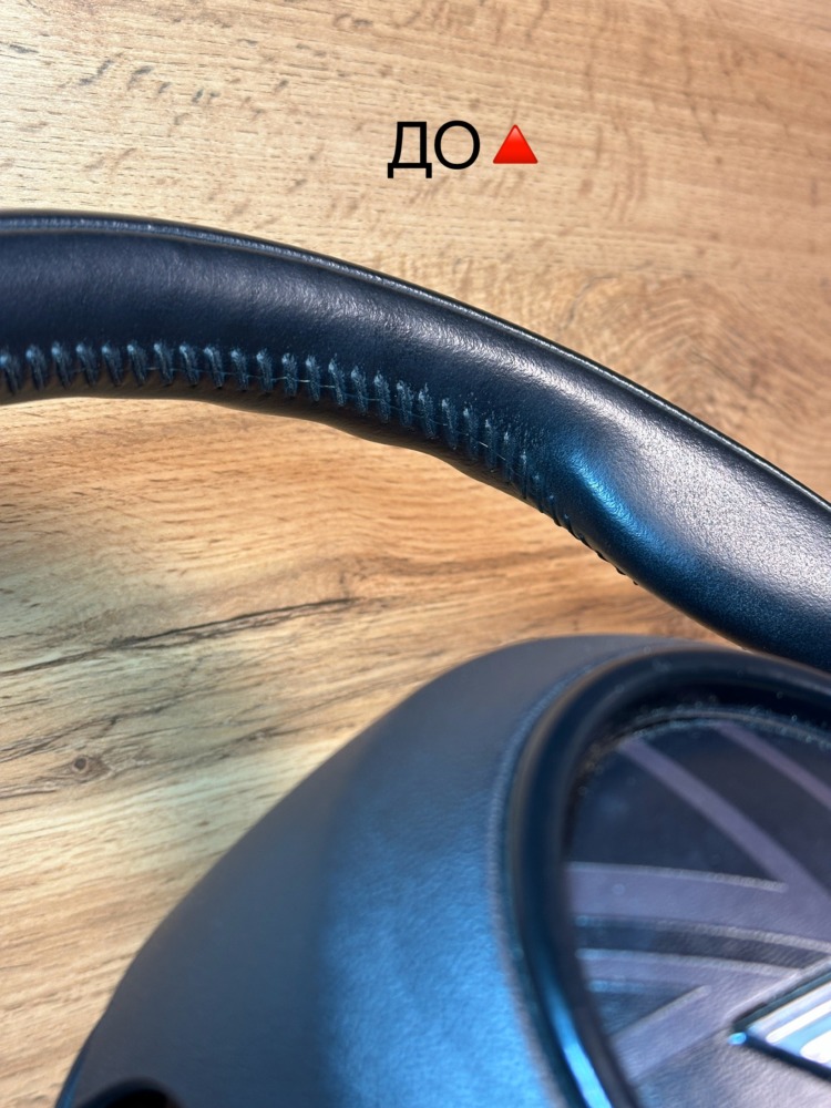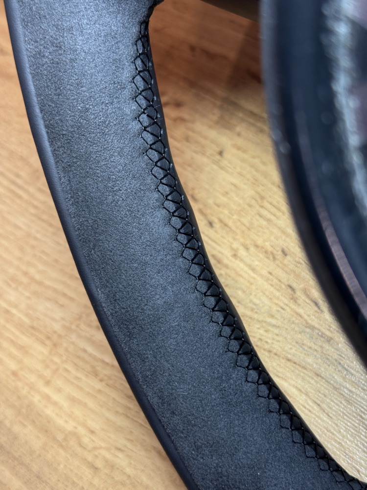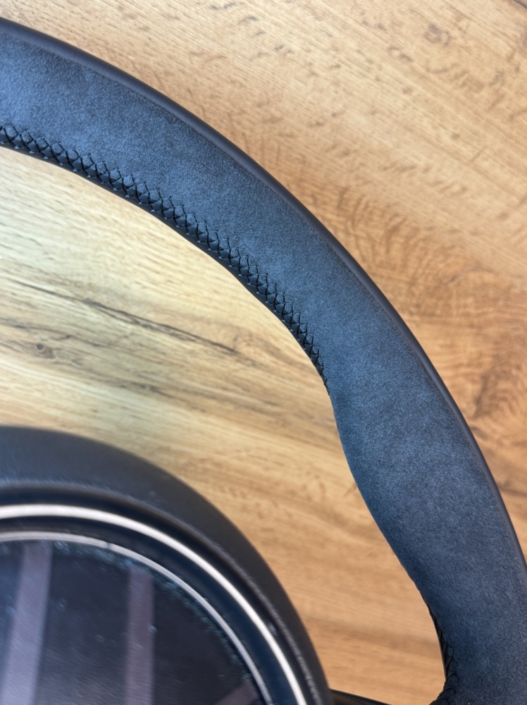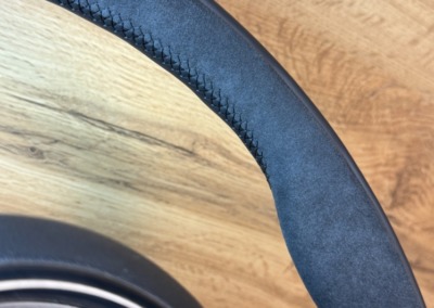 Мы перешили руль в алькантару цвета антрацит в комбинации с черной кожей, а дополнила всю картину черная нить.