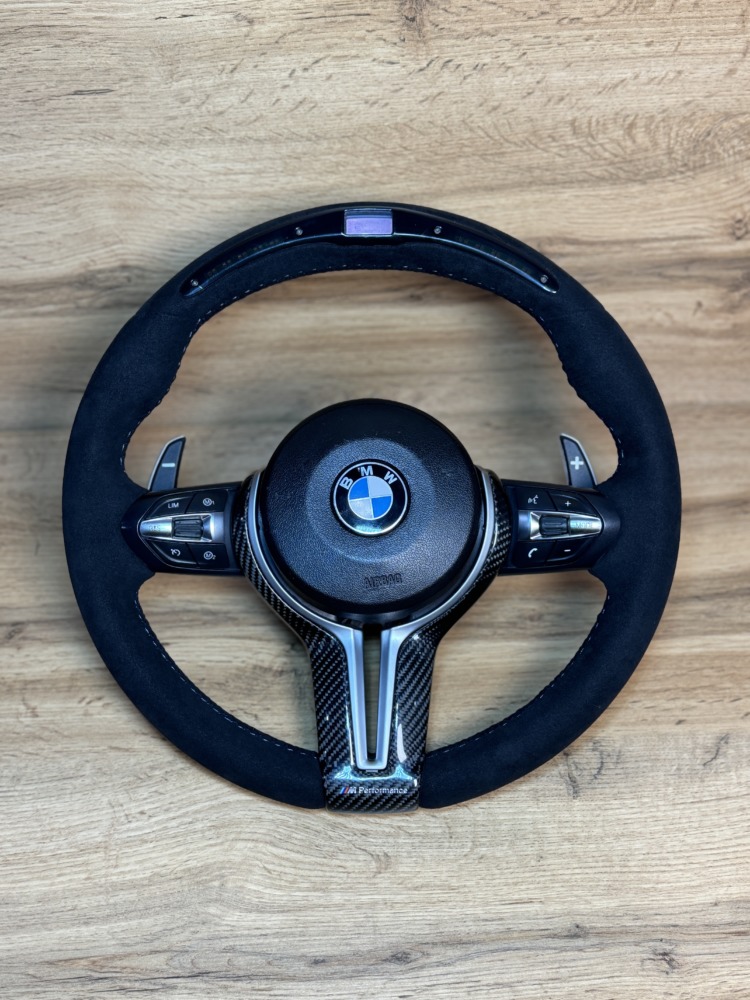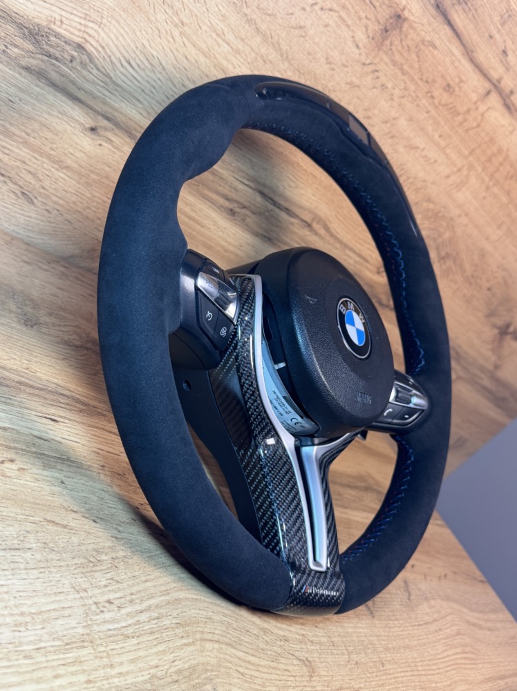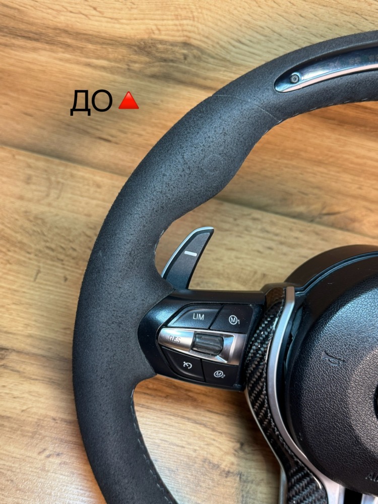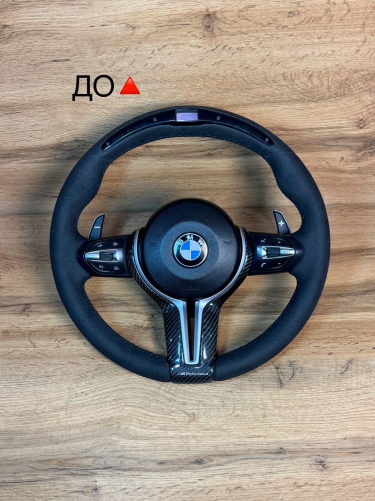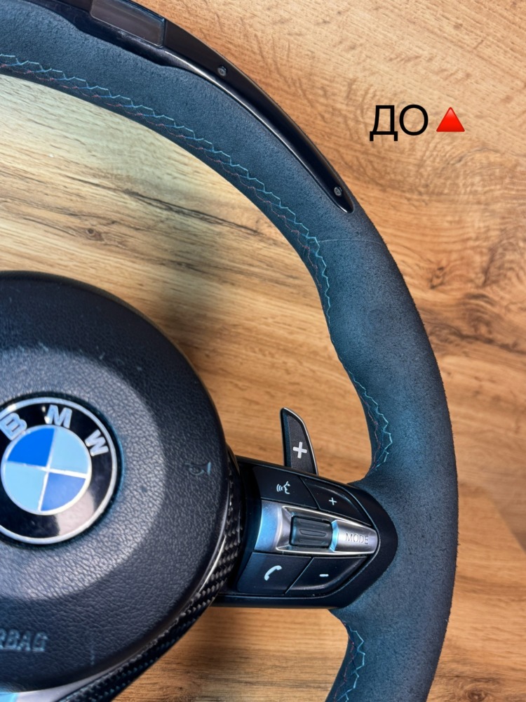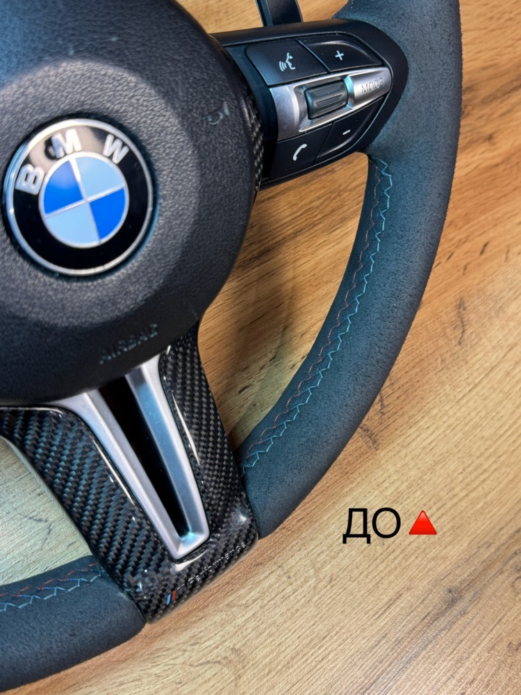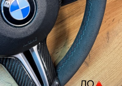 Руль от BMW X6 M перетянули под оригинал в алькантару с добавлением M строчки Руль от BMW X6 M перетянули под оригинал в алькантару с добавлением M строчки. Рули перетягиваем с сохранением штатного подогрева! В кожу, алькантару. Можем перетянуть подушку, перекрасить пластик и даже изменить анатомию руля.