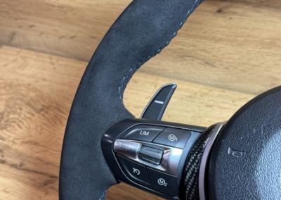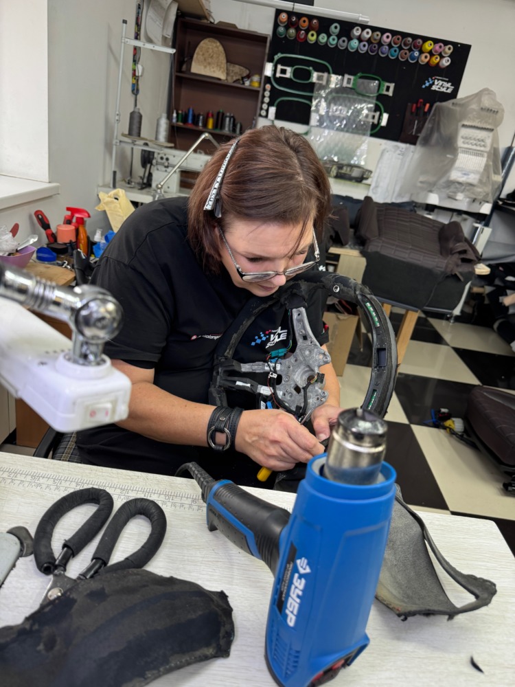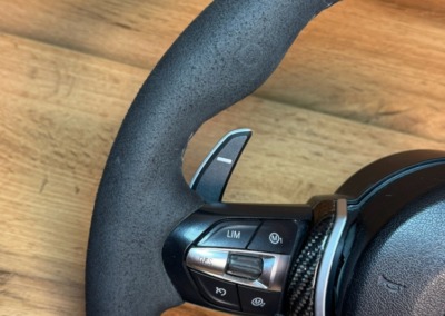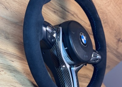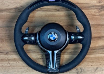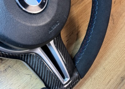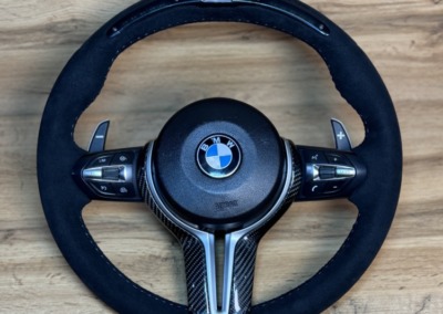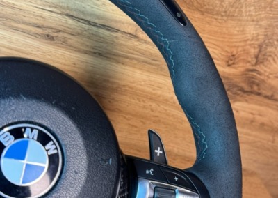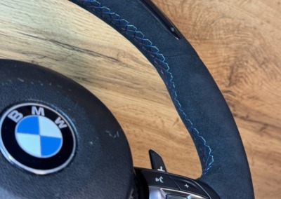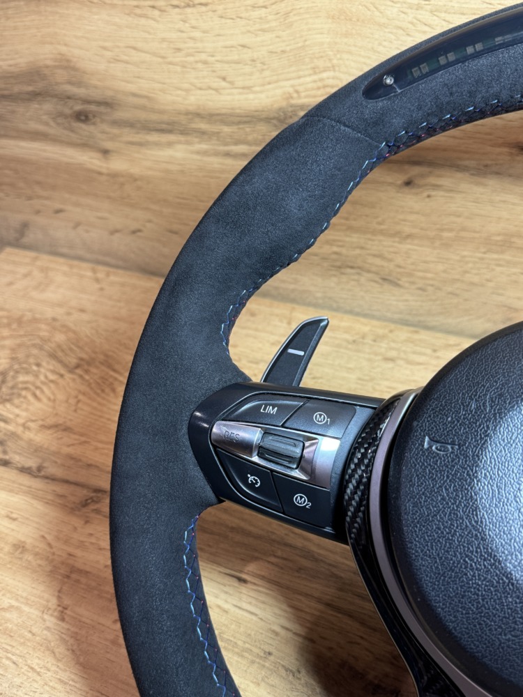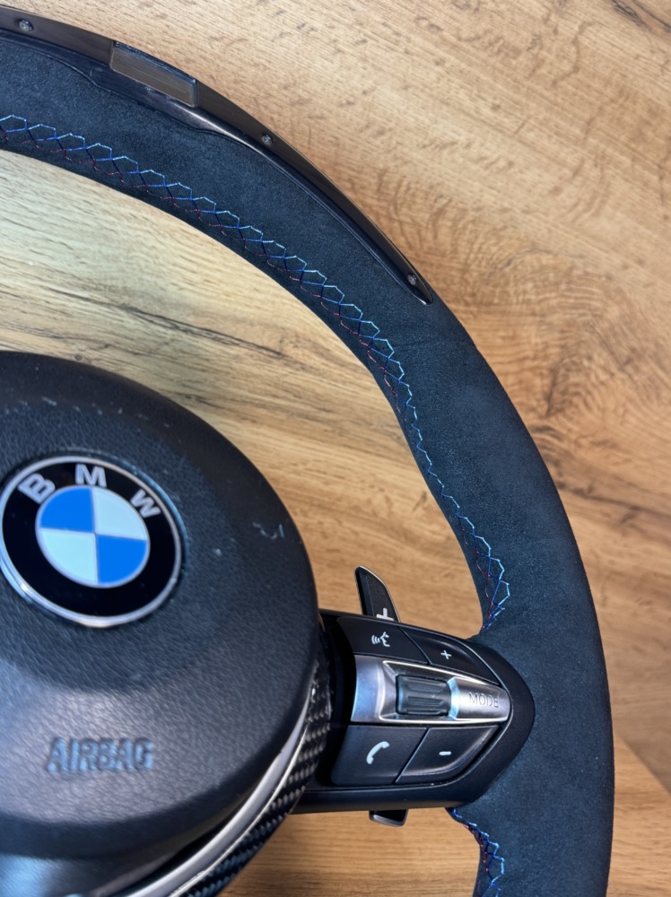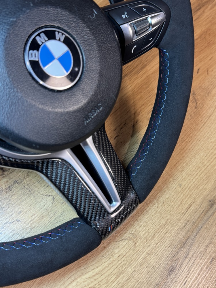 Руль от BMW X6 M перетянули под оригинал в алькантару с добавлением M строчки Руль от BMW X6 M перетянули под оригинал в алькантару с добавлением M строчки. Рули перетягиваем с сохранением штатного подогрева! В кожу, алькантару. Можем перетянуть подушку, перекрасить пластик и даже изменить анатомию руля.