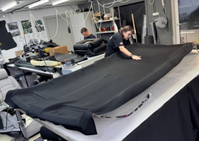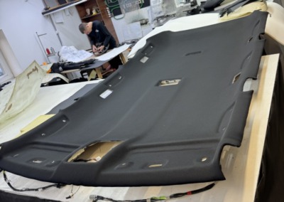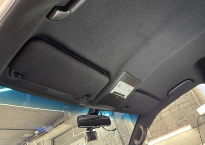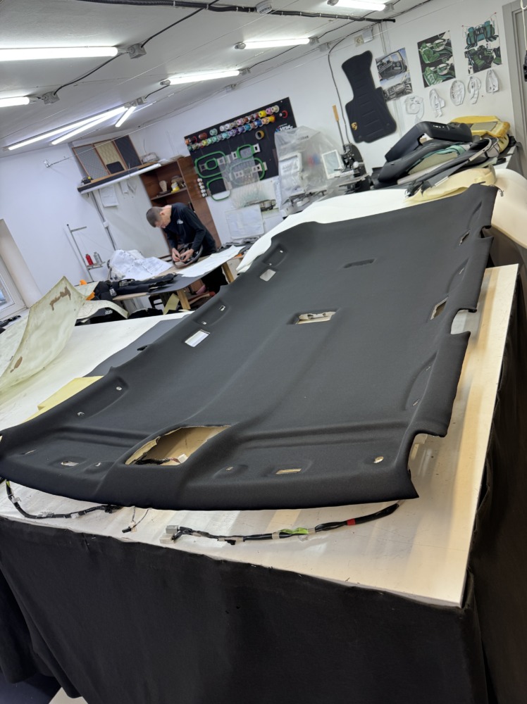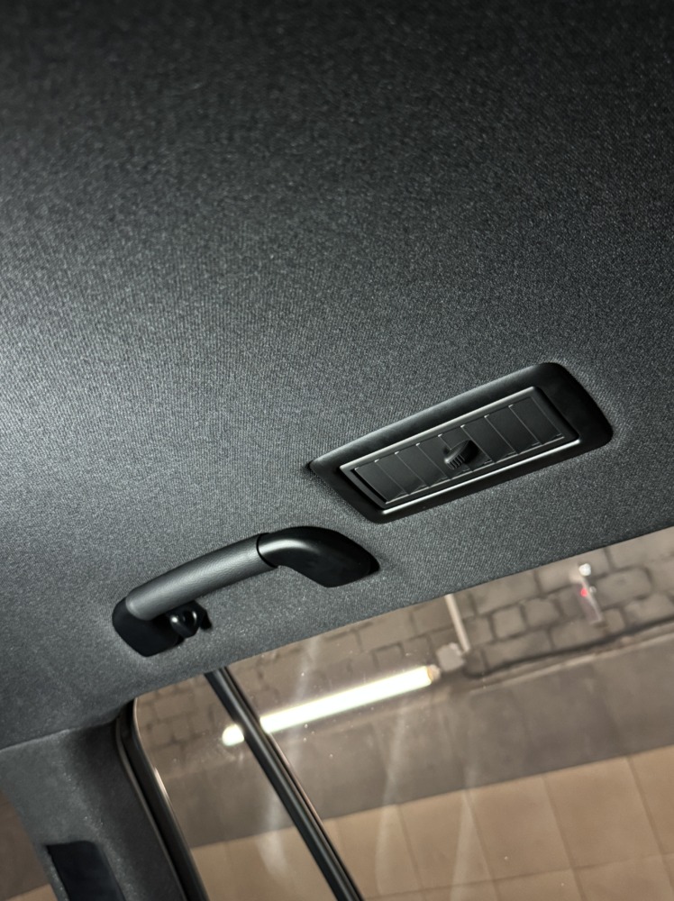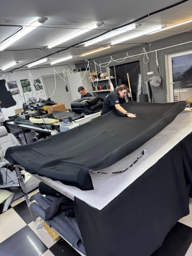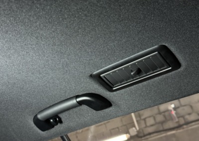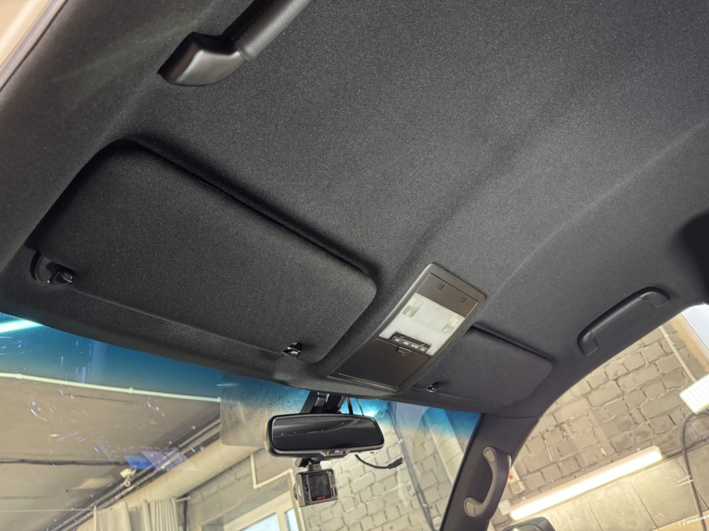 Светлый потолок перетянули в чёрную потолочную ткань, с покраской пластика в чёрный мат.