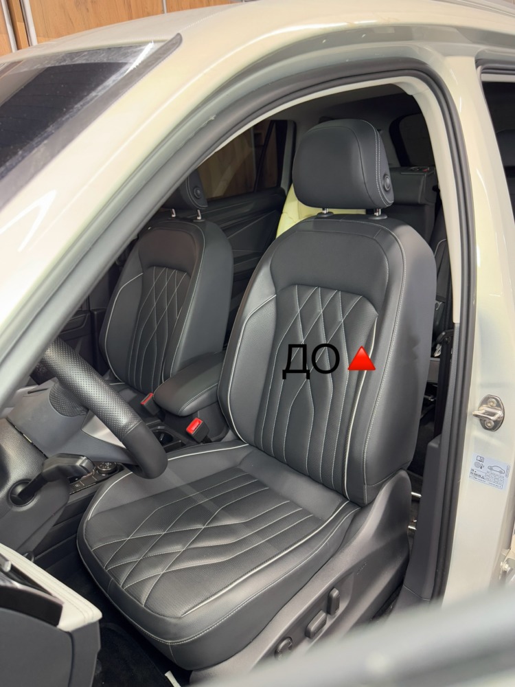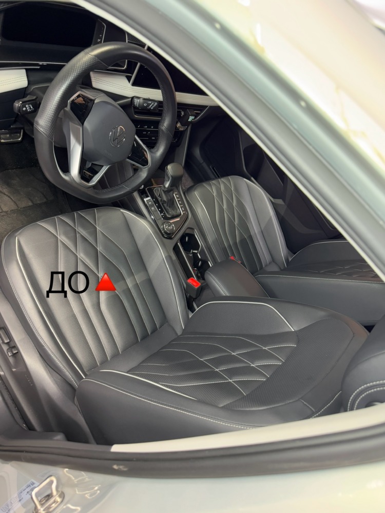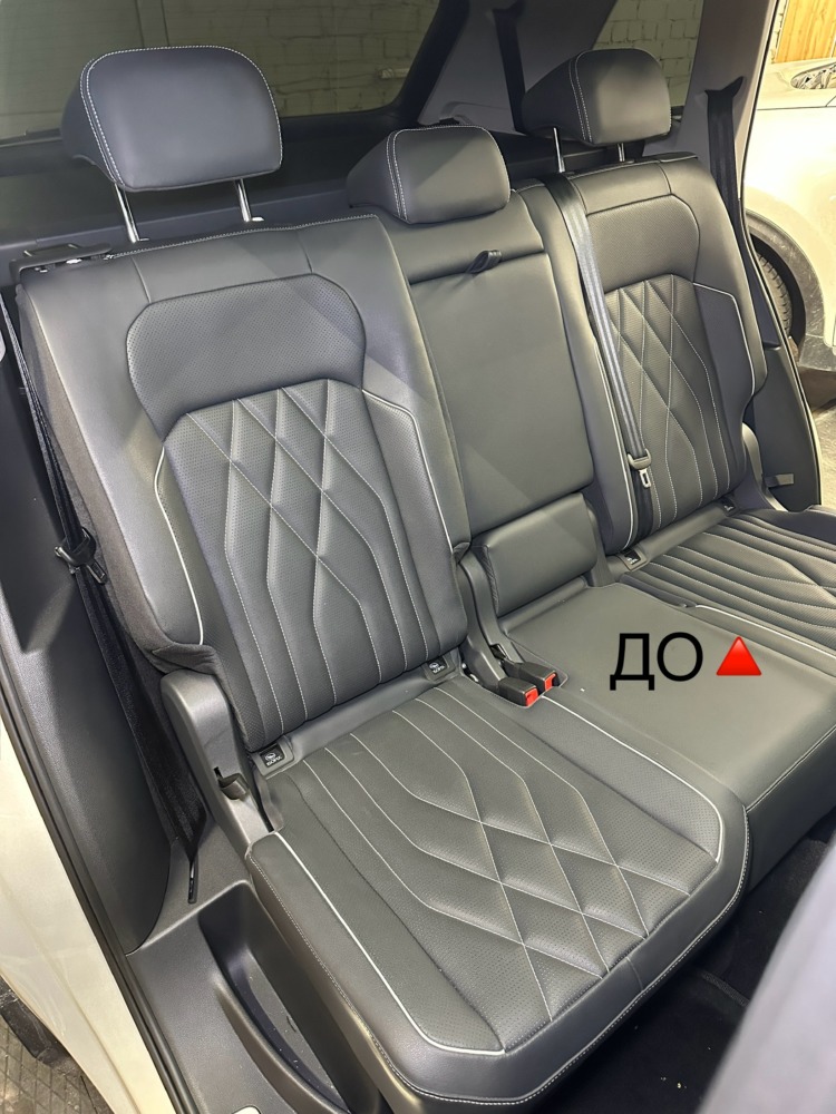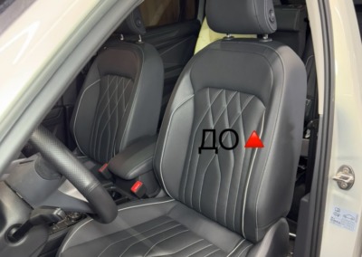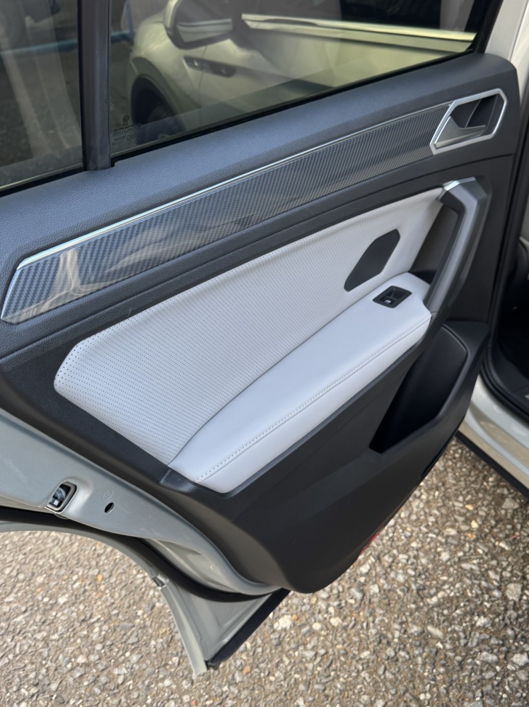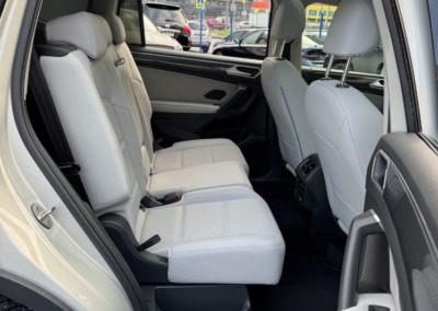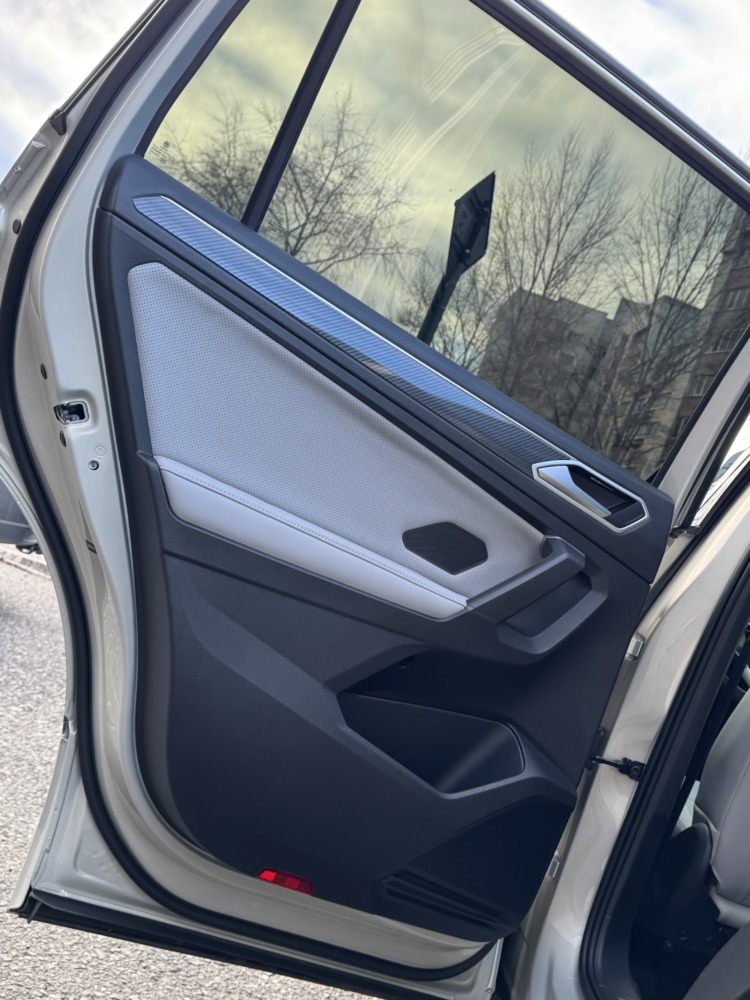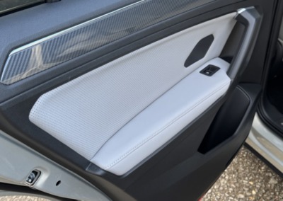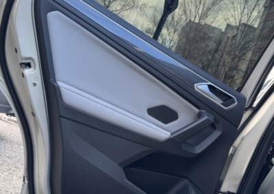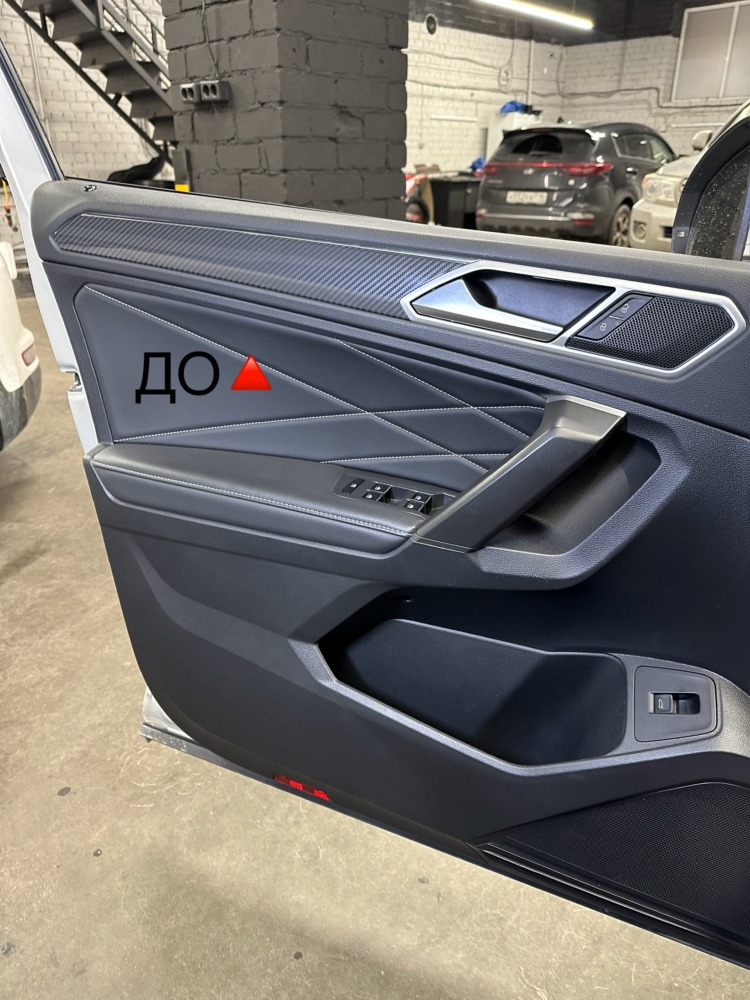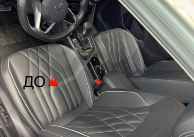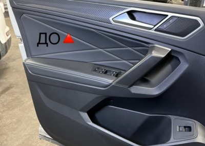 Например, на этом новом Volkswagen Tiguan мы кардинально изменили интерьер: перетянули сиденья и дверные карты не просто изменив цвет, но и полностью обновив их дизайн.