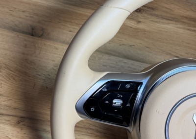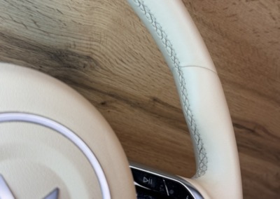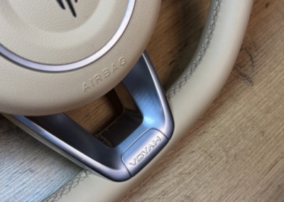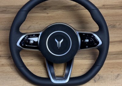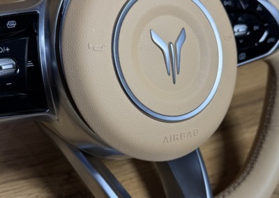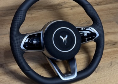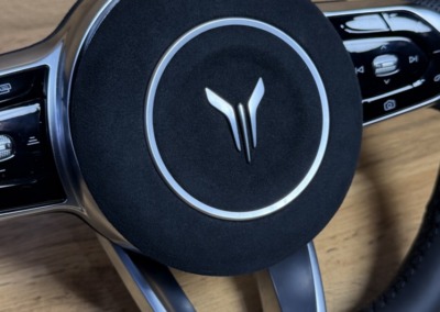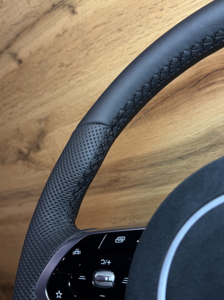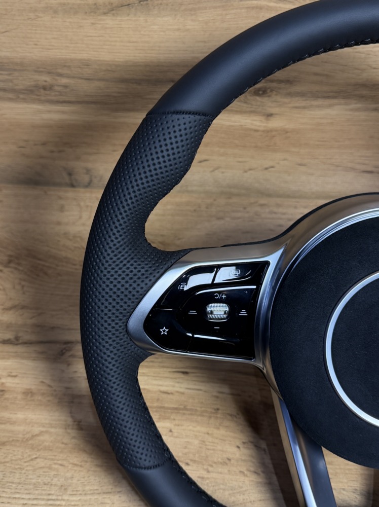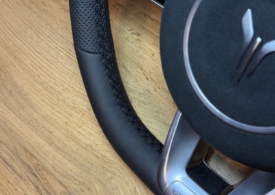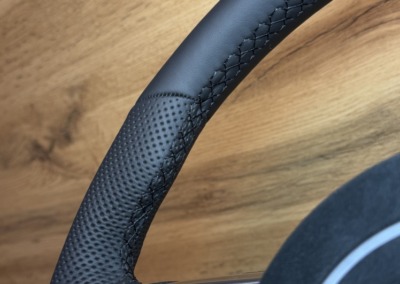Мы перетянули обод руля в чёрную кожу, скомбинировав гладкую кожу и псевдоперфорацию, а подушку выполнили из алькантары.